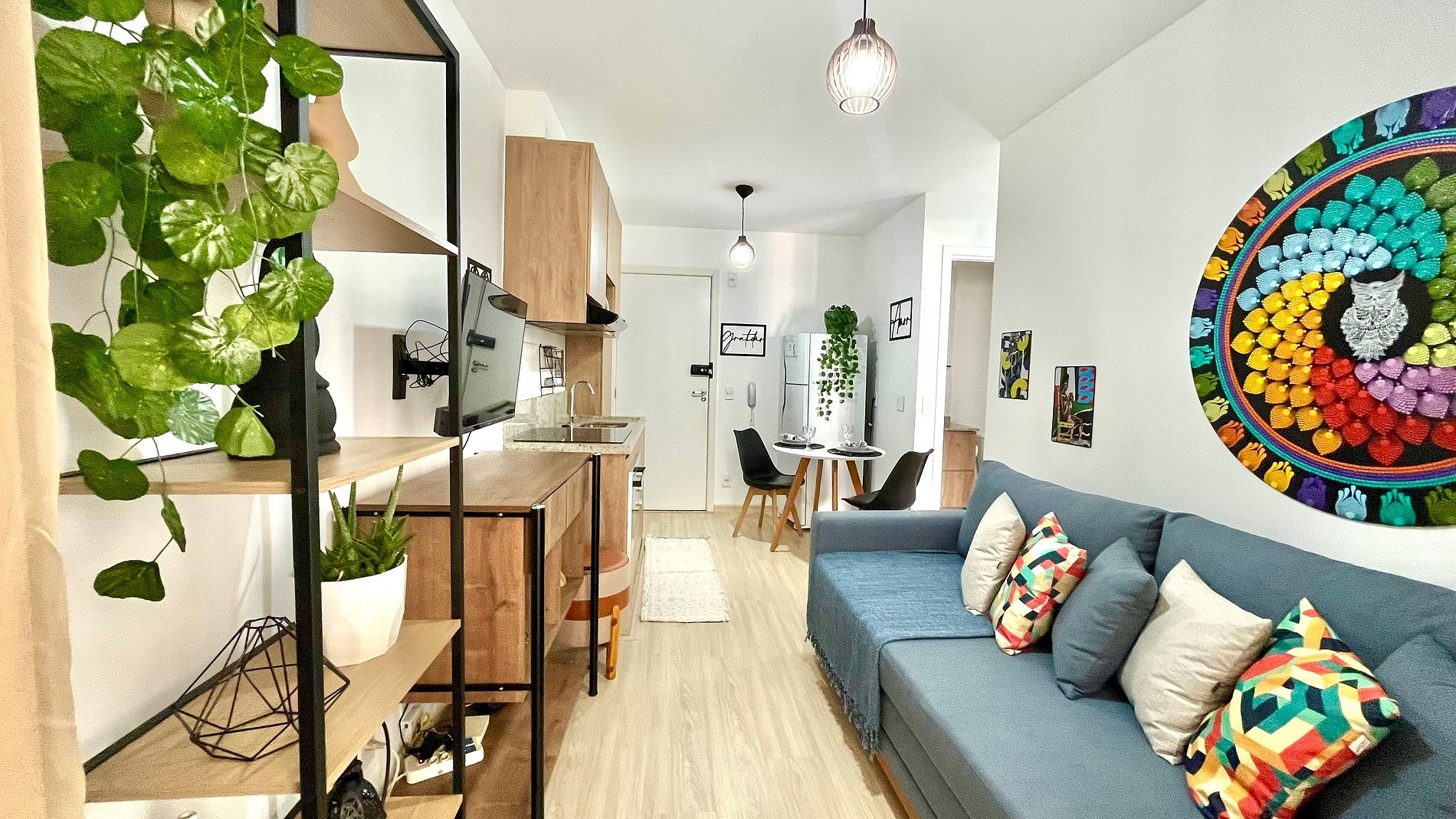 O espaço com 40 m² tem decoração cheia de personalidade, ambientes integrados e equipamentos para acomodar com conforto até 4 pessoas, dispondo de uma cama e um sofá cama de casal.
