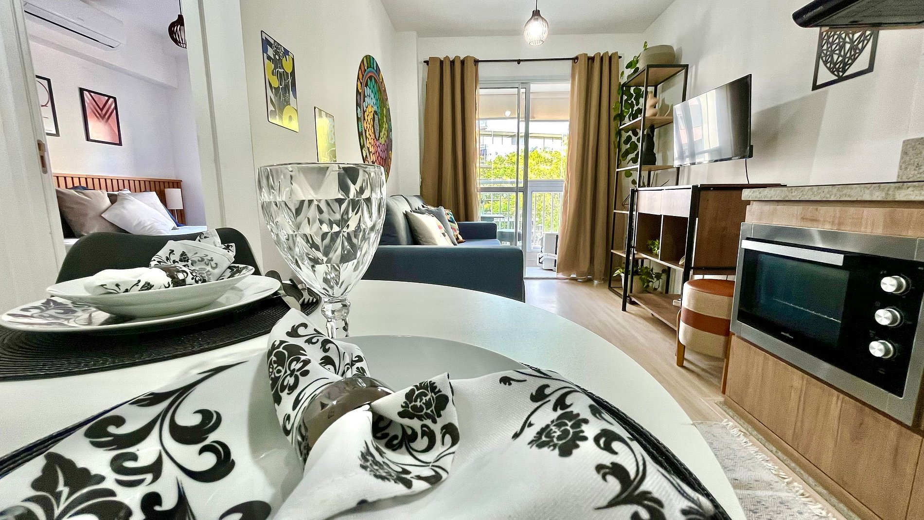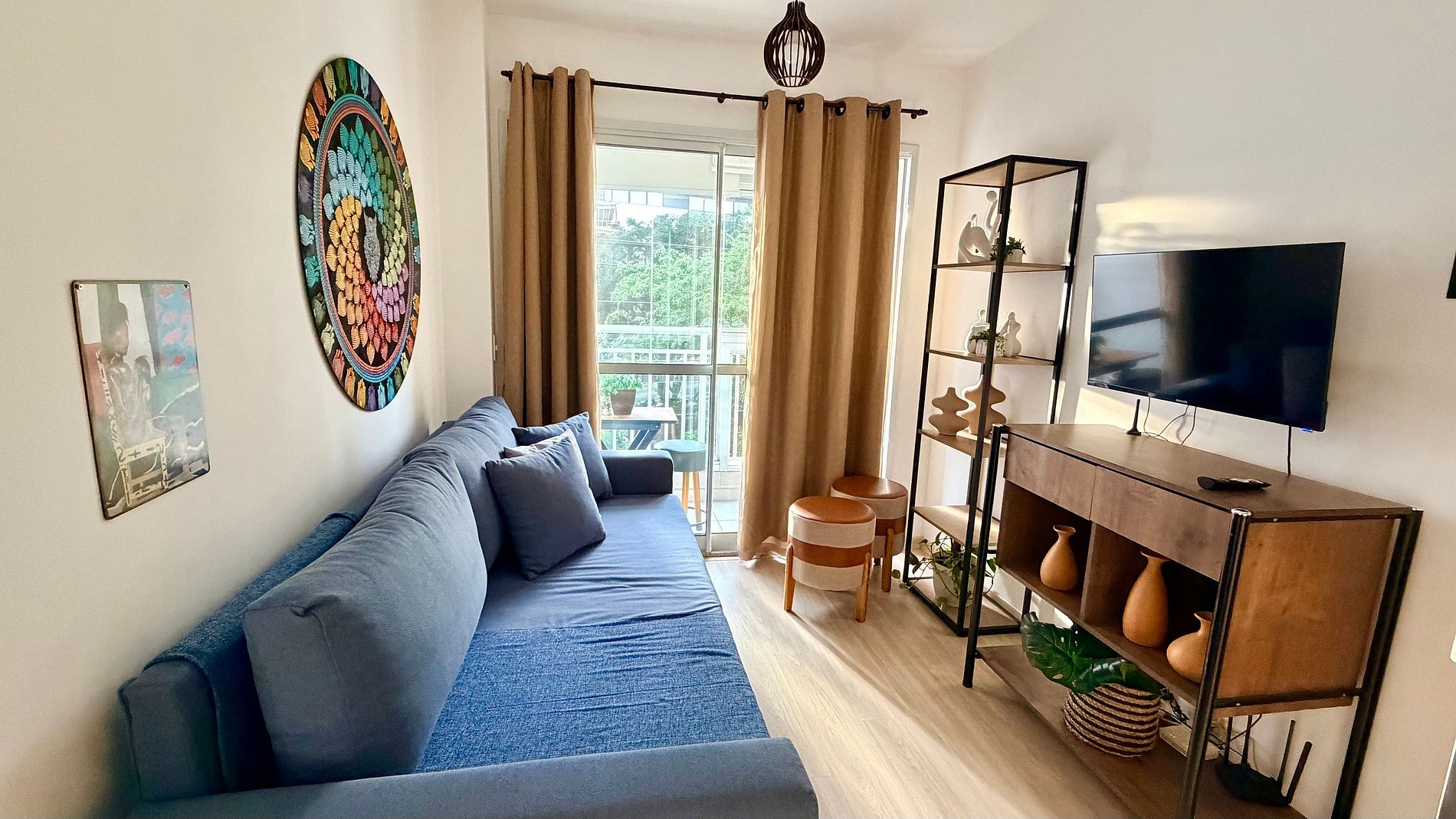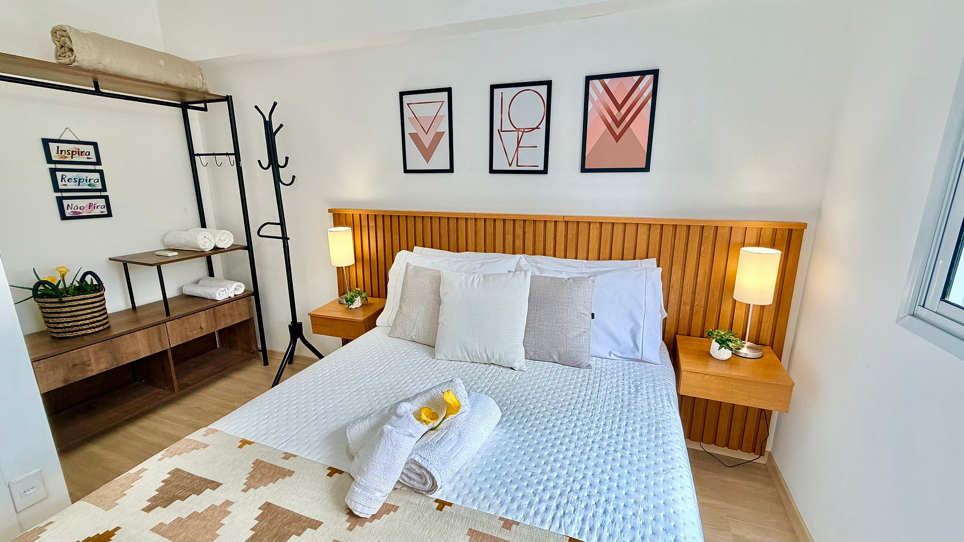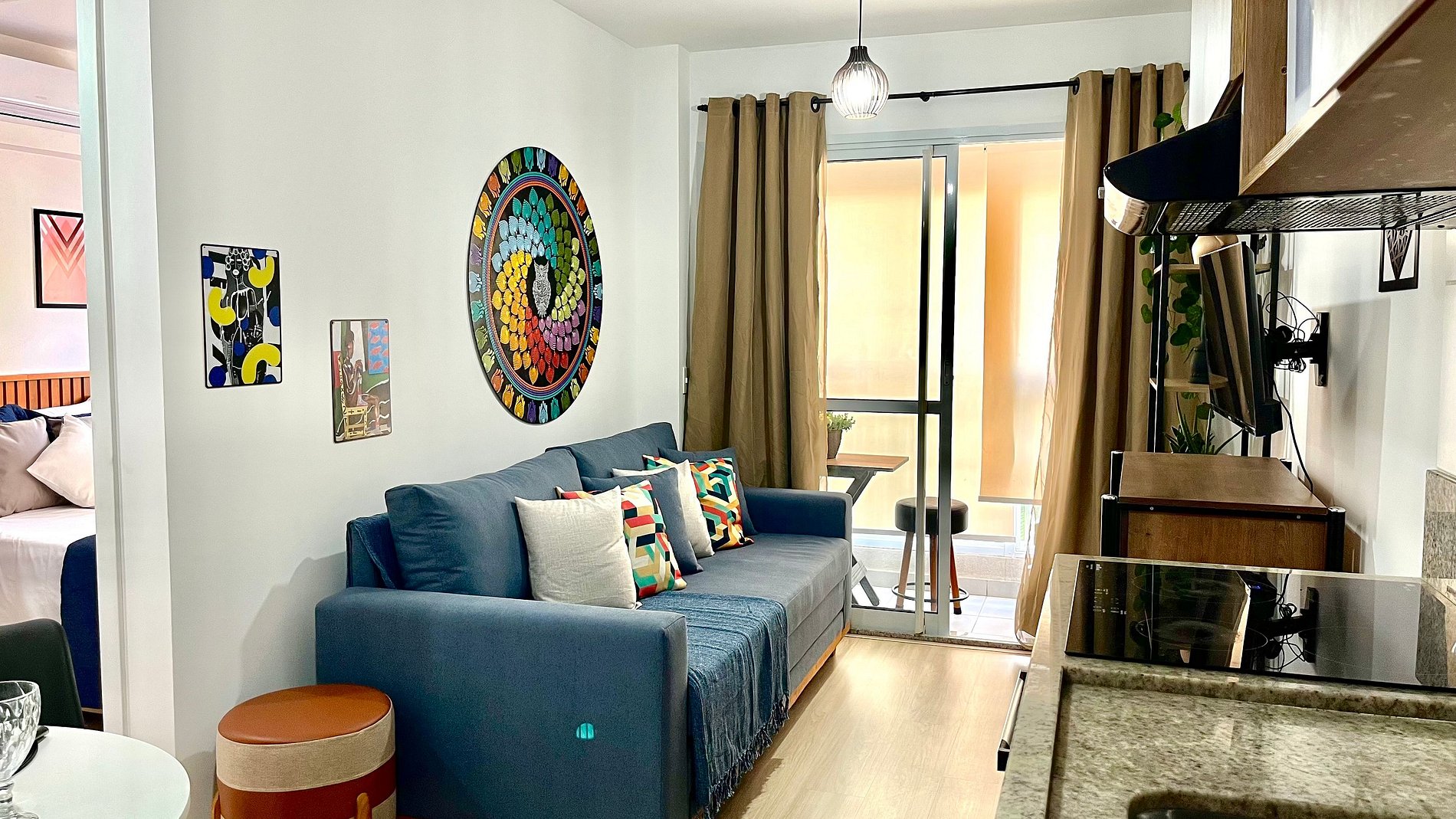 O espaço com 40 m² tem decoração cheia de personalidade, ambientes integrados e equipamentos para acomodar com conforto até 4 pessoas, dispondo de uma cama e um sofá cama de casal.