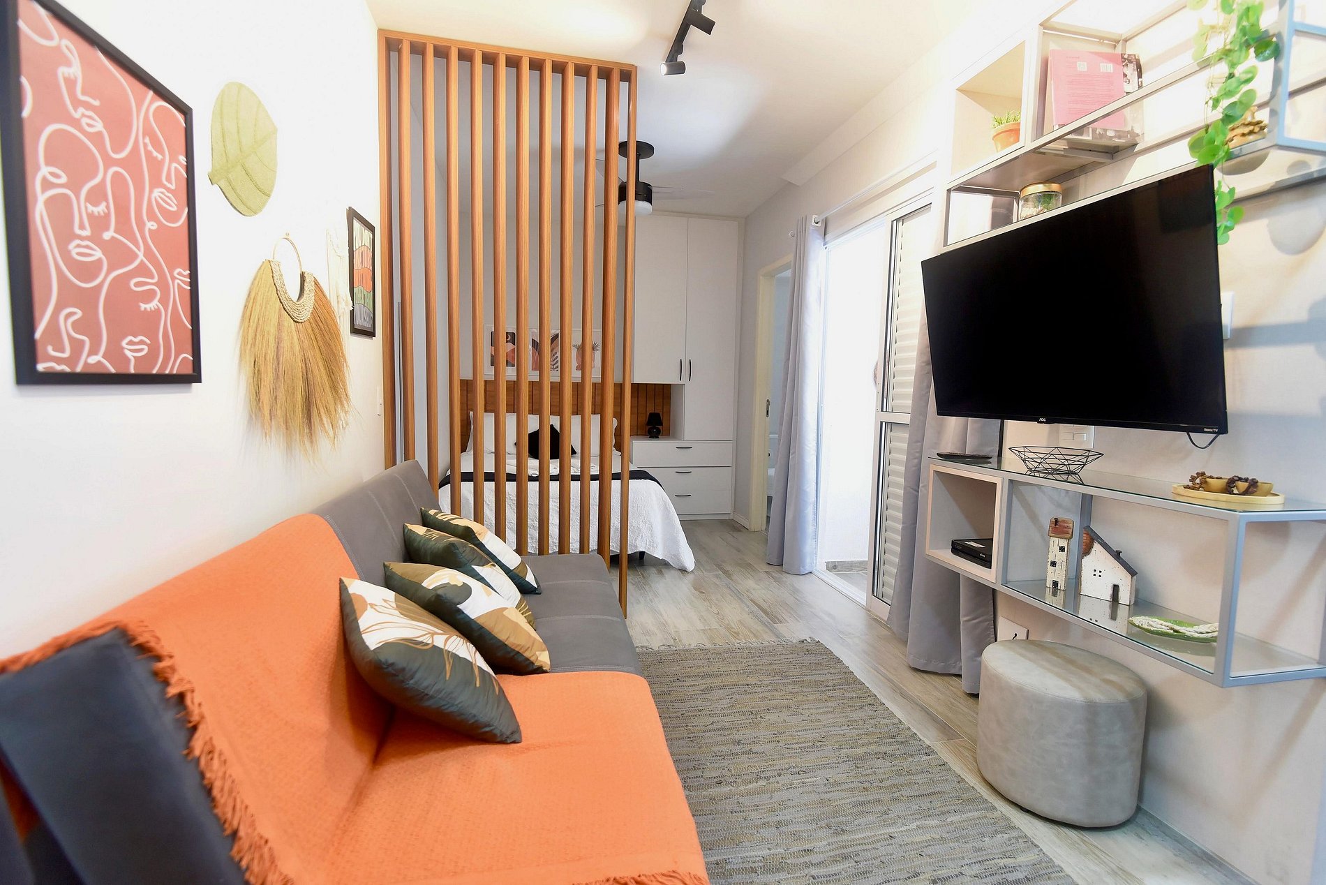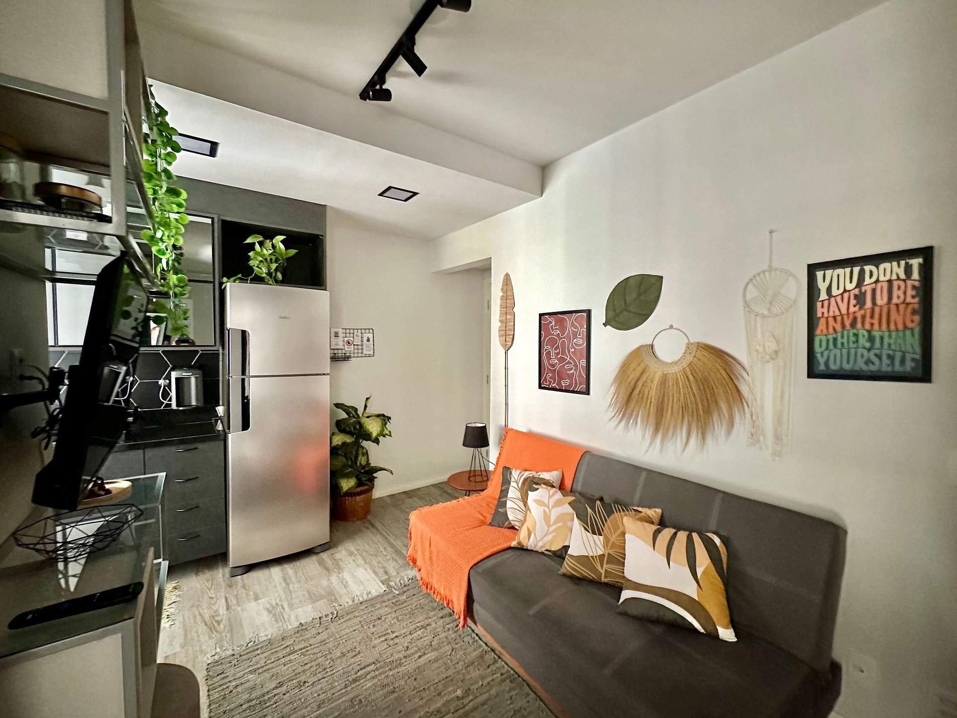 O espaço com decoração cheia de personalidade, ambientes integrados e equipamentos para acomodar com conforto 4 pessoas em uma cama de casal e um sofá cama. Toda a privacidade para um café ou drink na varanda, assistir a um filme na Smart TV ou mesmo para desfrutar da área comum do condomínio.