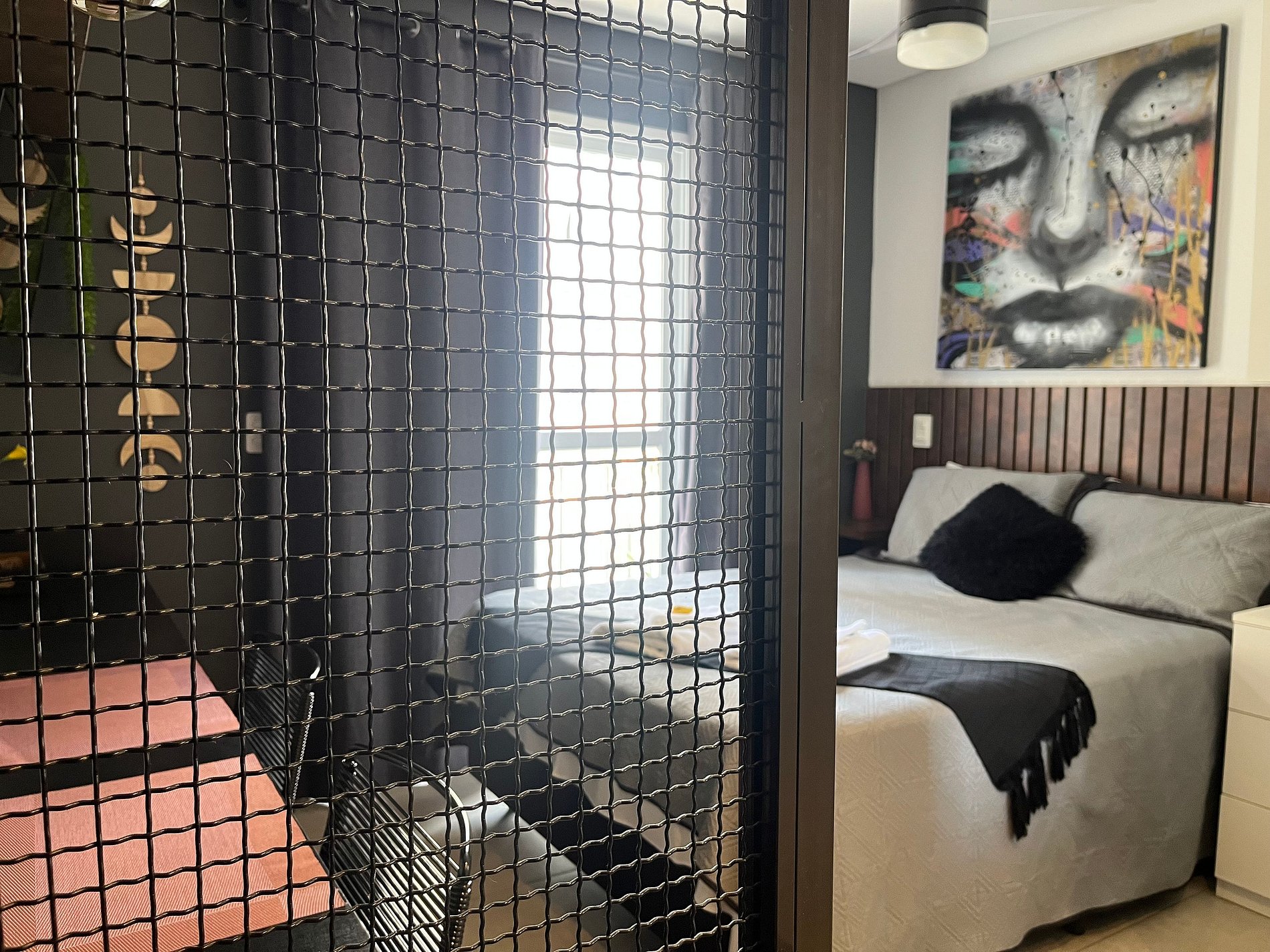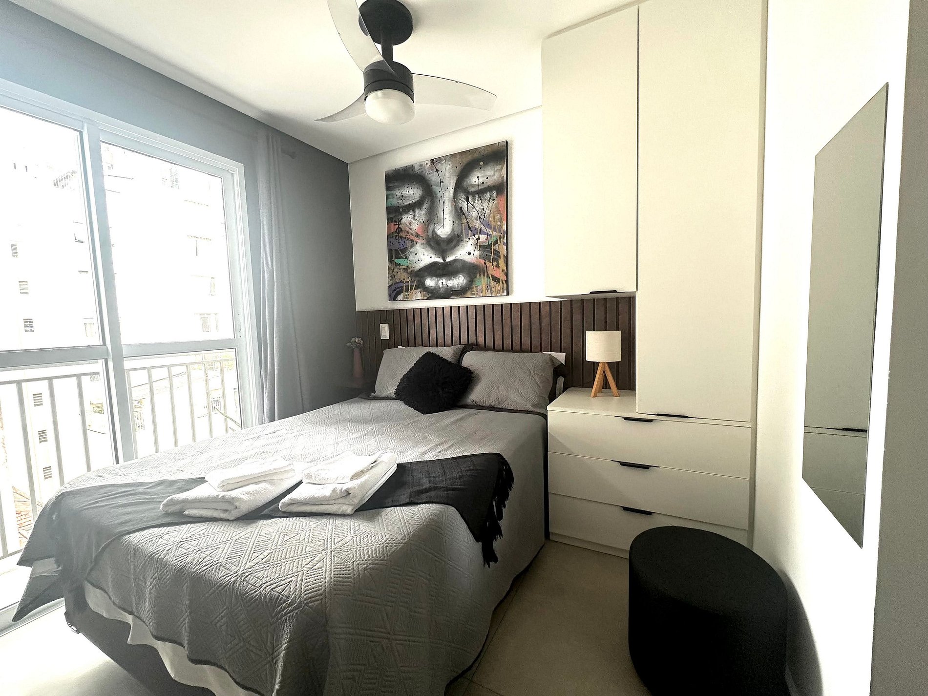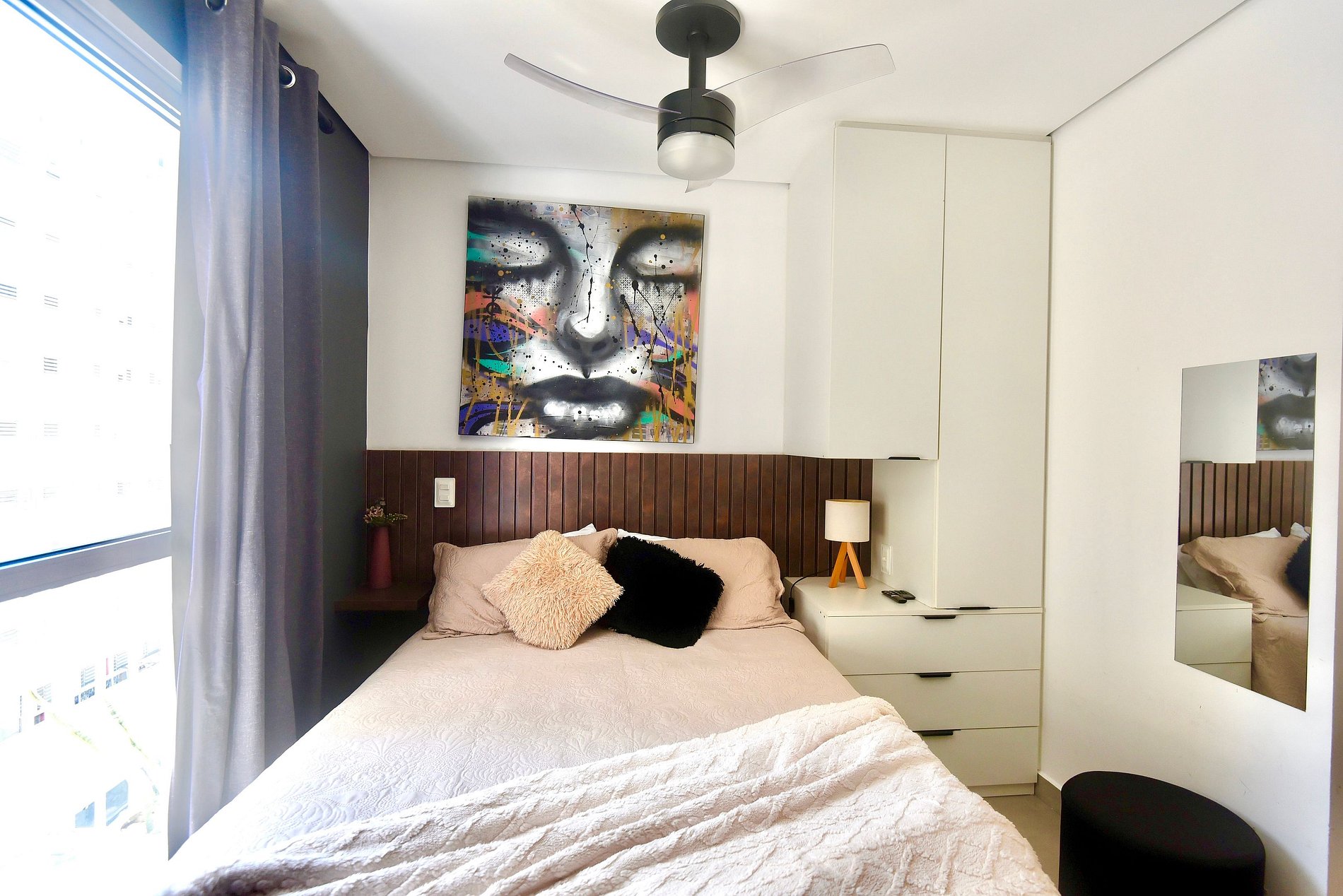 O espaço conta com uma decoração cheia de personalidade, ambientes integrados e equipamentos para acomodar com conforto 2 pessoas, dispondo de uma cama de casal. Toda a privacidade para um café ou drink, assistir a um filme na Smart TV ou mesmo para desfrutar da área comum do condomínio.