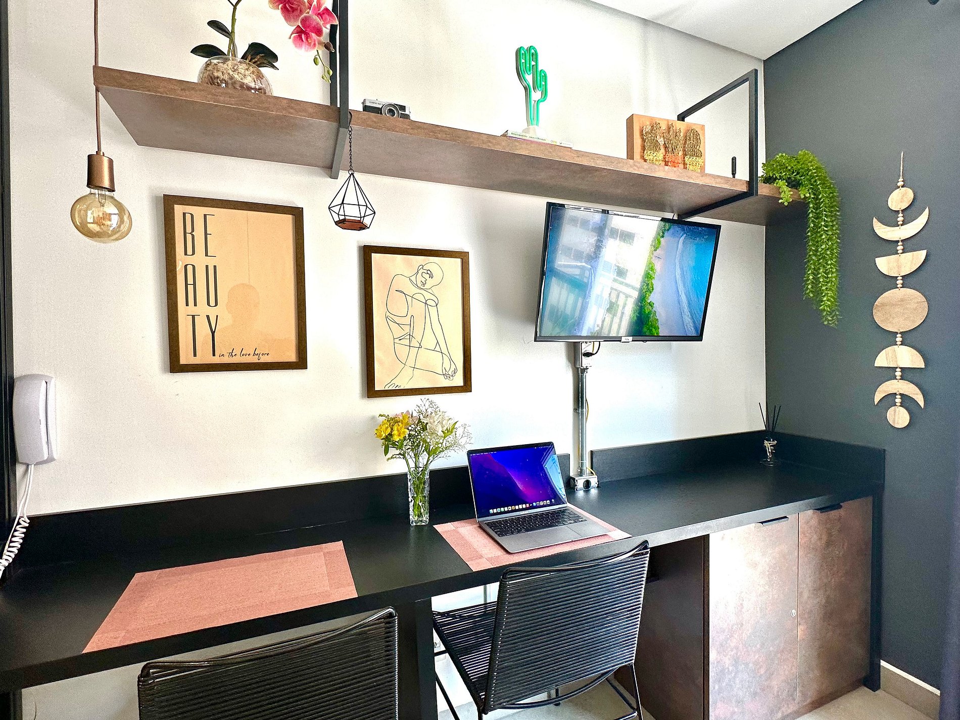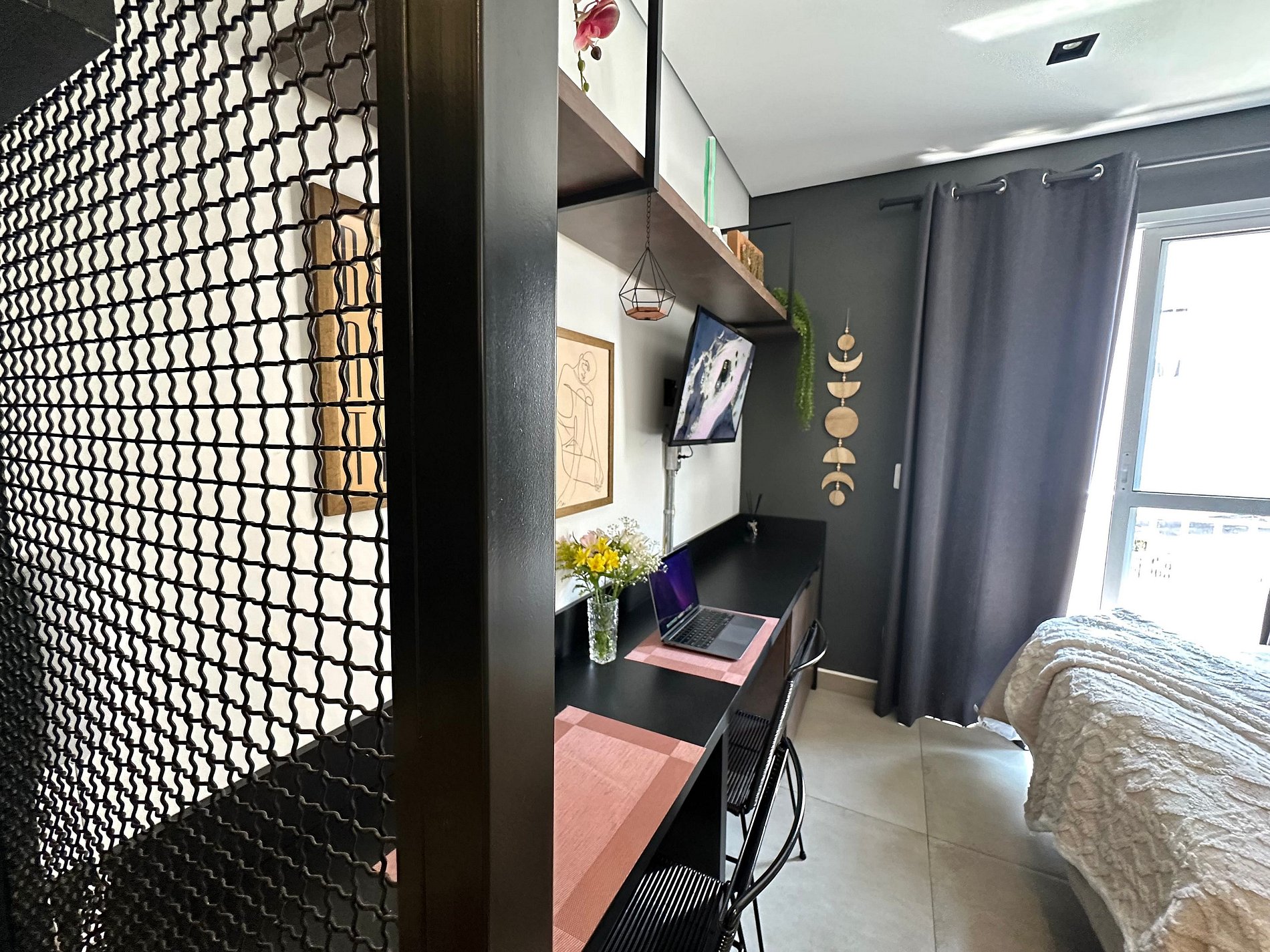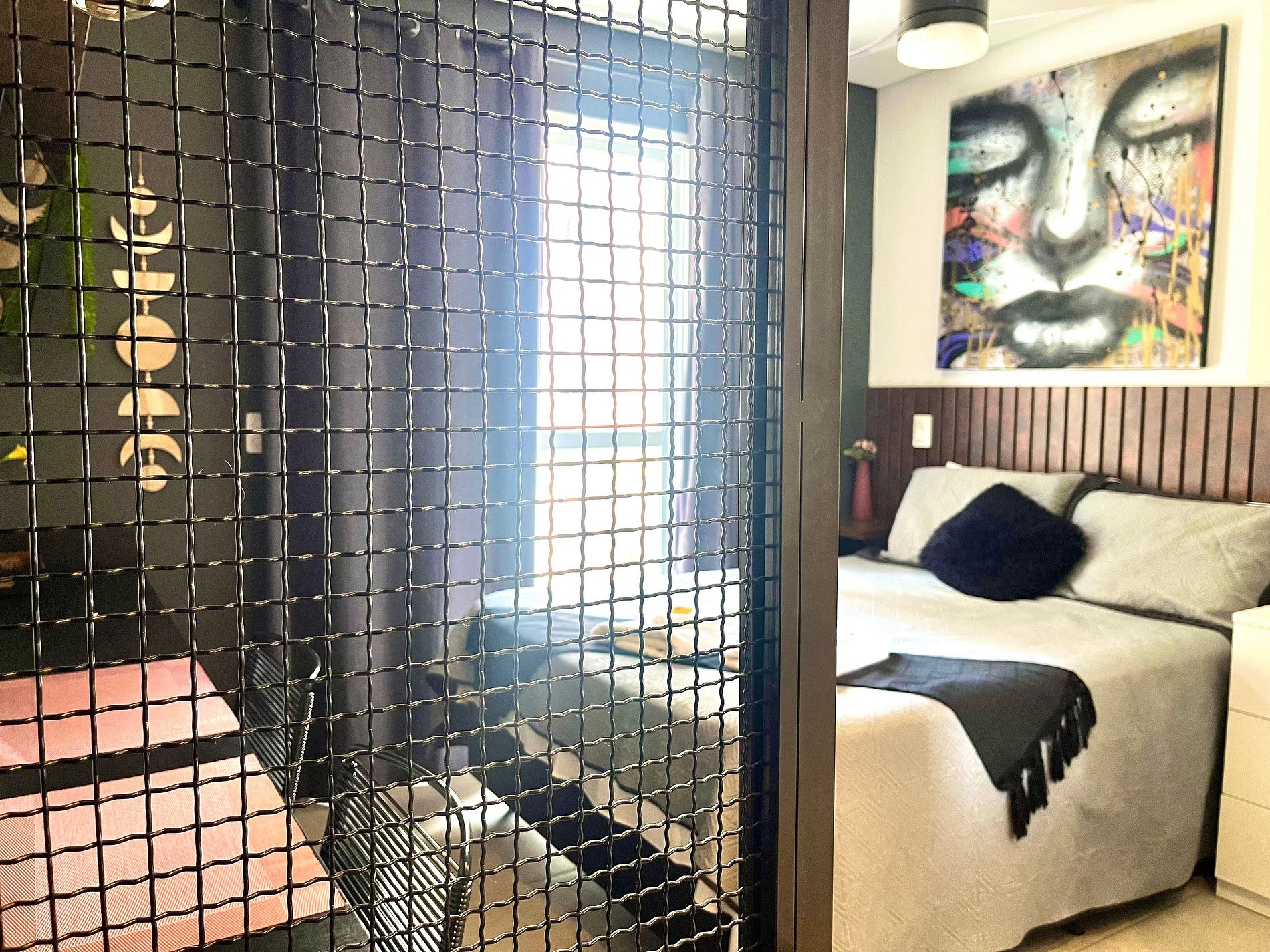 O espaço conta com uma decoração cheia de personalidade, ambientes integrados e equipamentos para acomodar com conforto 2 pessoas, dispondo de uma cama de casal. Toda a privacidade para um café ou drink, assistir a um filme na Smart TV ou mesmo para desfrutar da área comum do condomínio.
