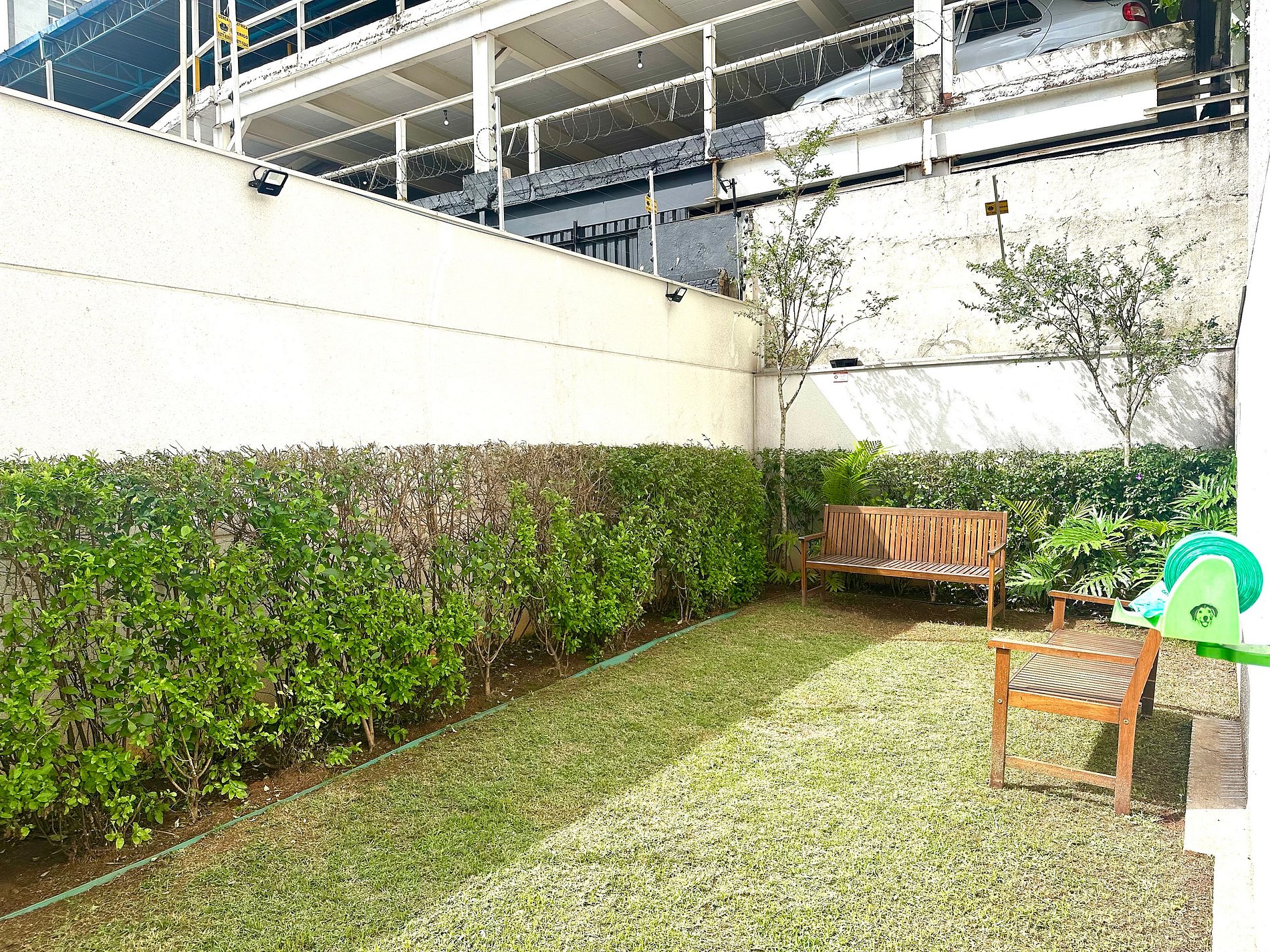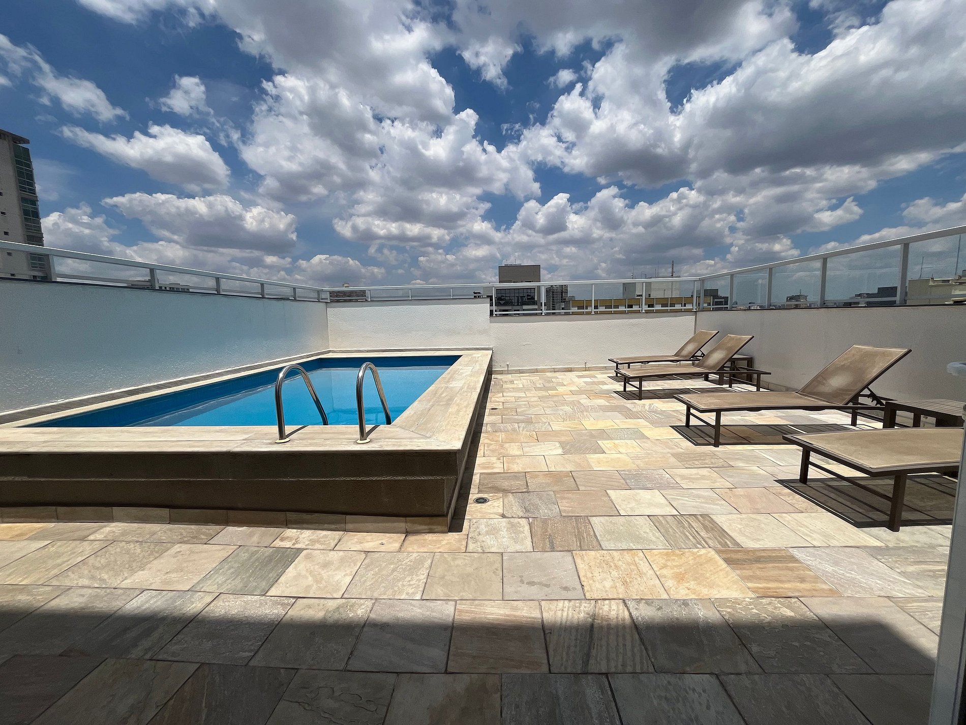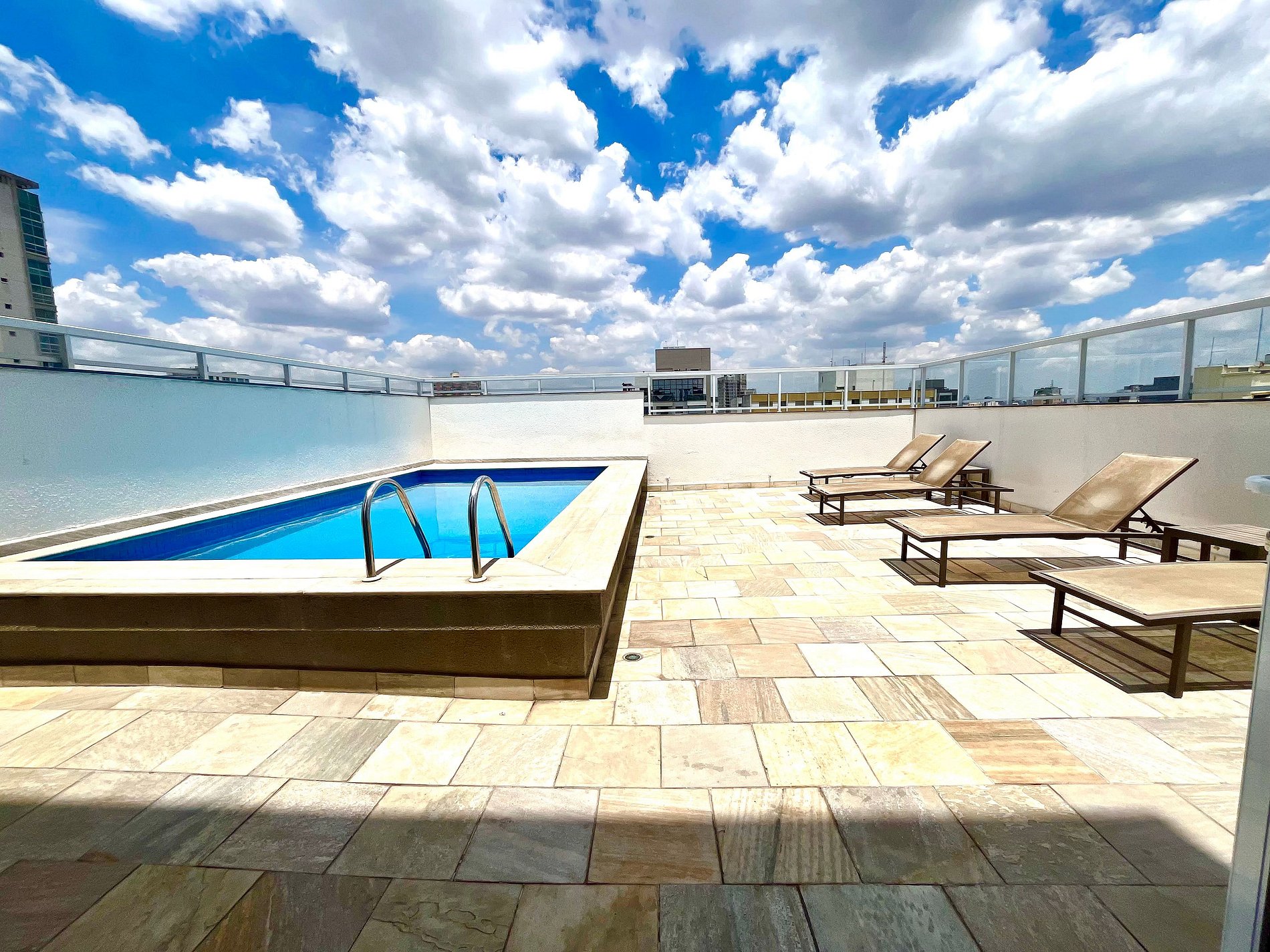 Além das instalações internas, o prédio oferece área de estar, vista do rooftop, piscina com espreguiçadeiras, academia e lavanderia compartilhada (paga), no último andar do prédio.