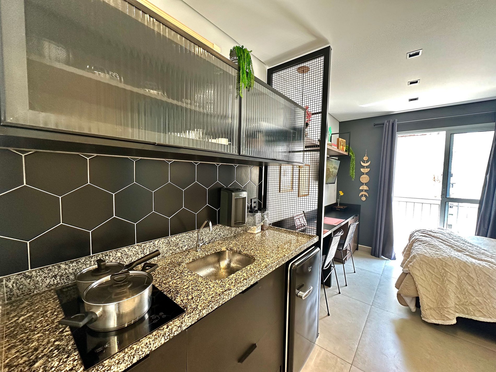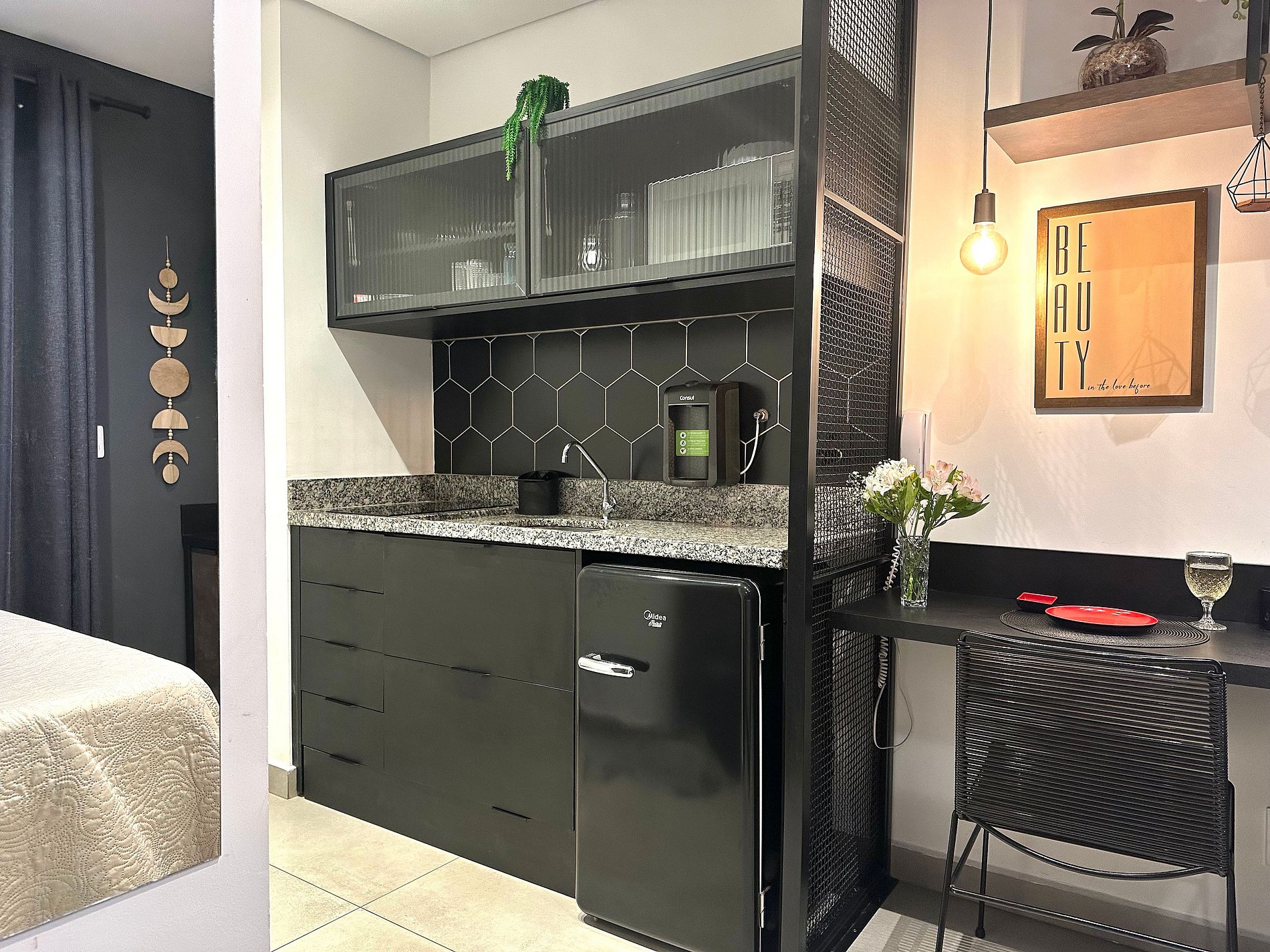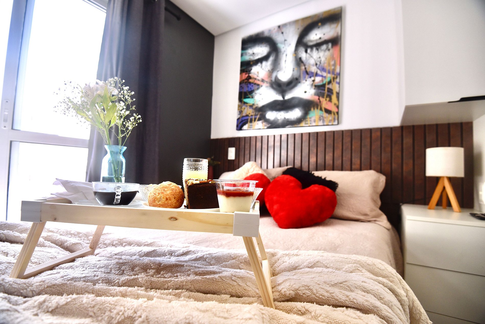 O espaço conta com uma decoração cheia de personalidade, ambientes integrados e equipamentos para acomodar com conforto 2 pessoas, dispondo de uma cama de casal. Toda a privacidade para um café ou drink, assistir a um filme na Smart TV ou mesmo para desfrutar da área comum do condomínio.