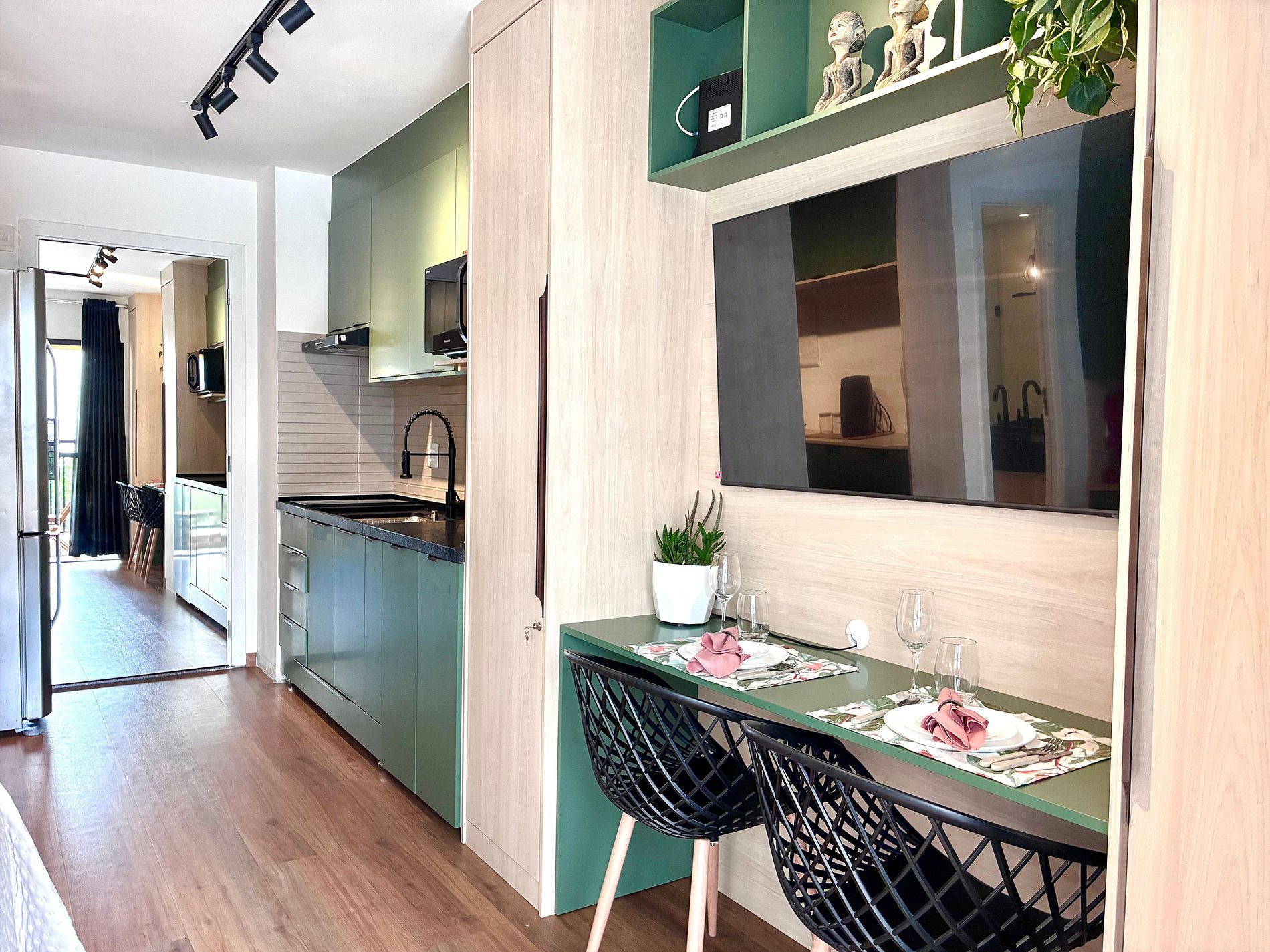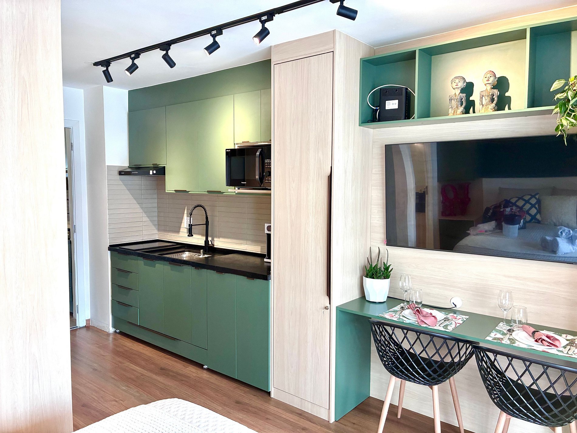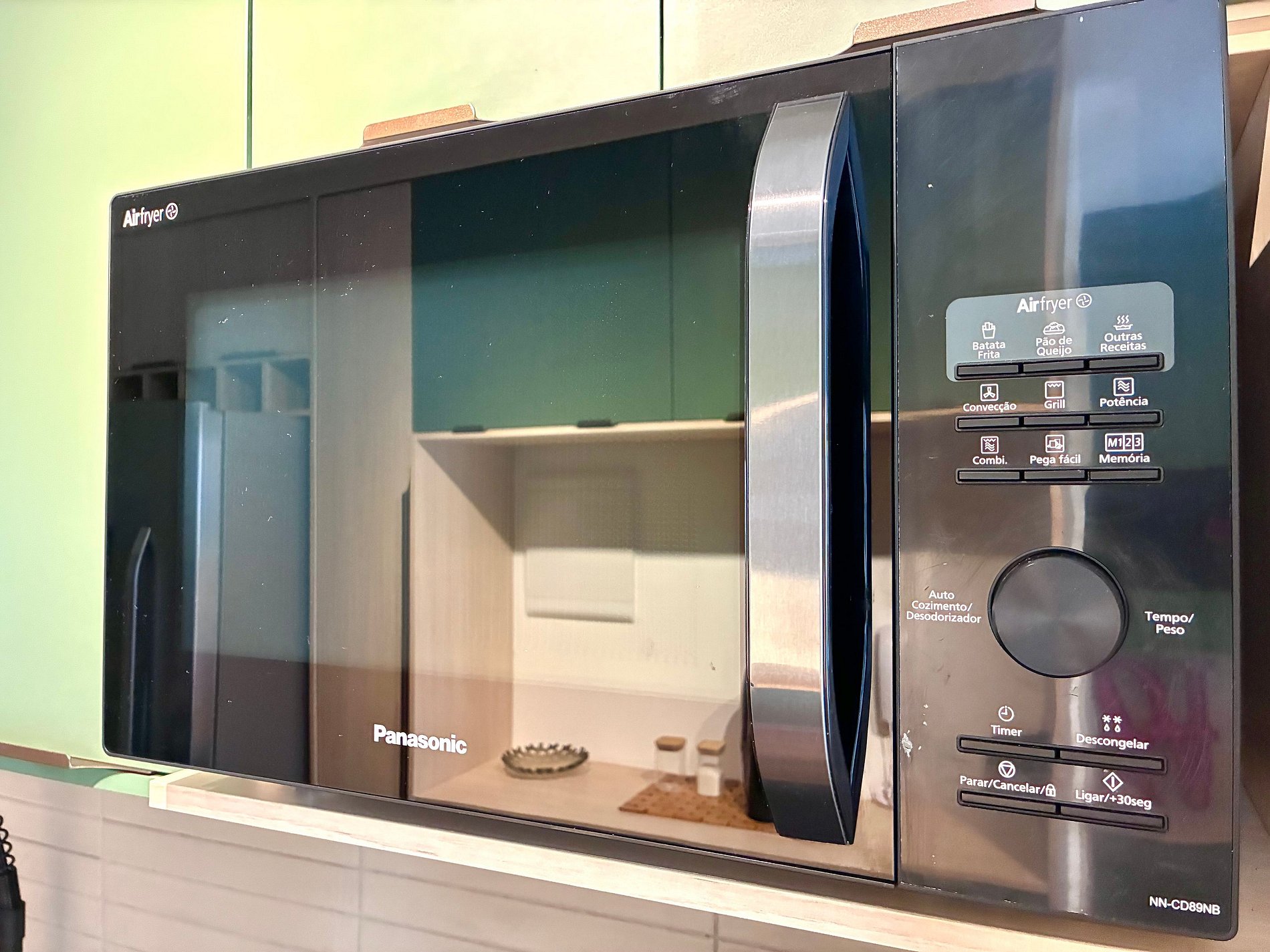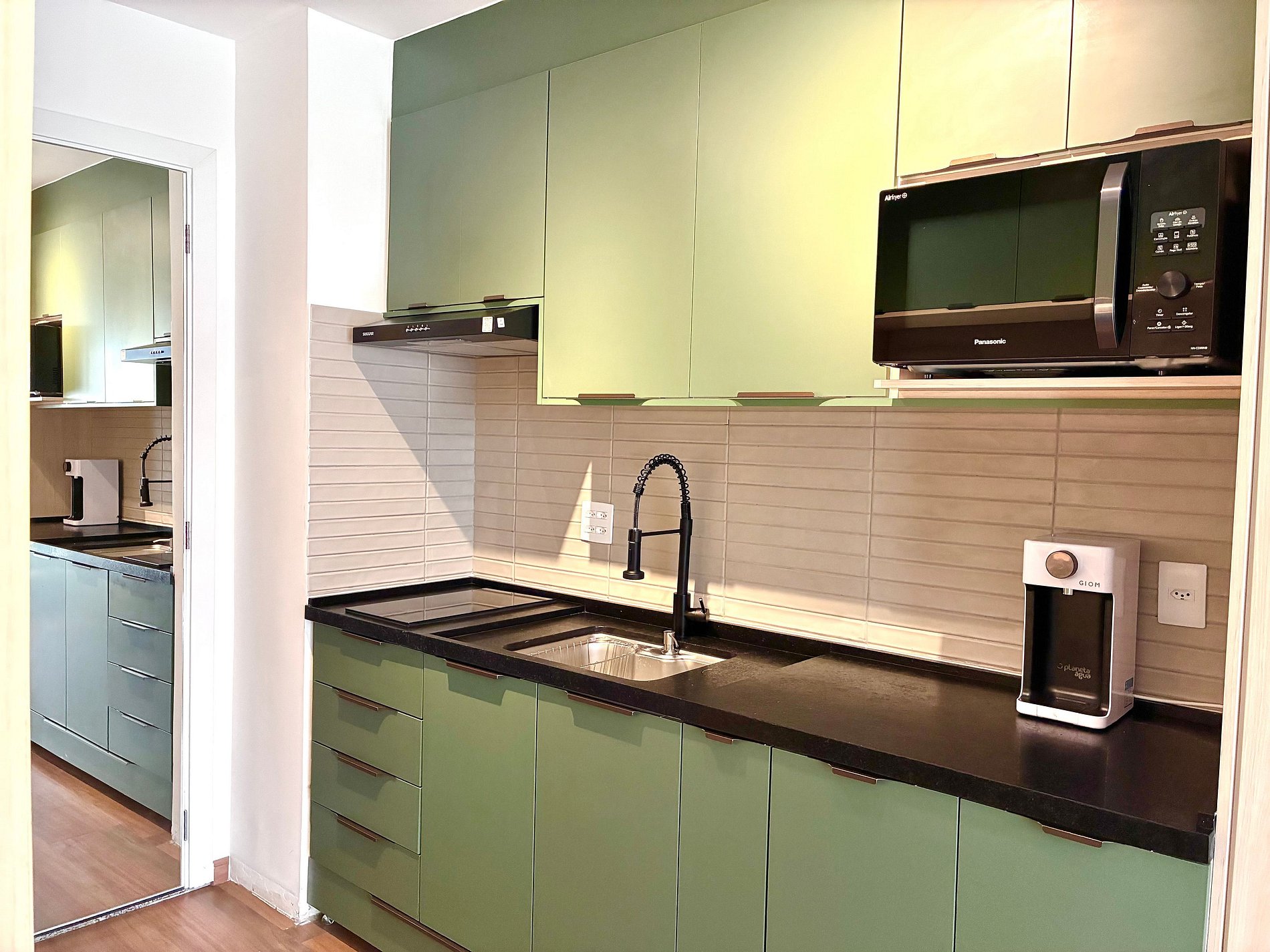 Cozinha completa com Air Fryer, micro-ondas e utensílios.