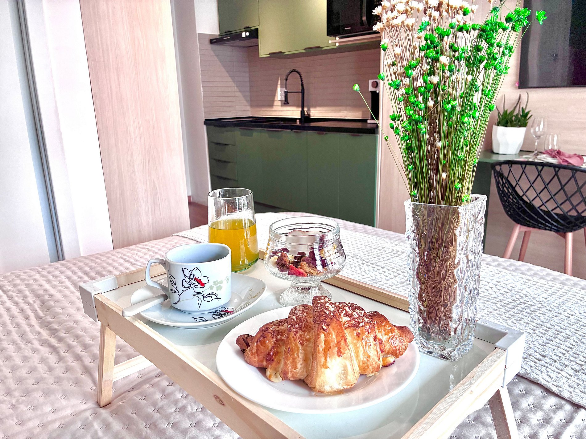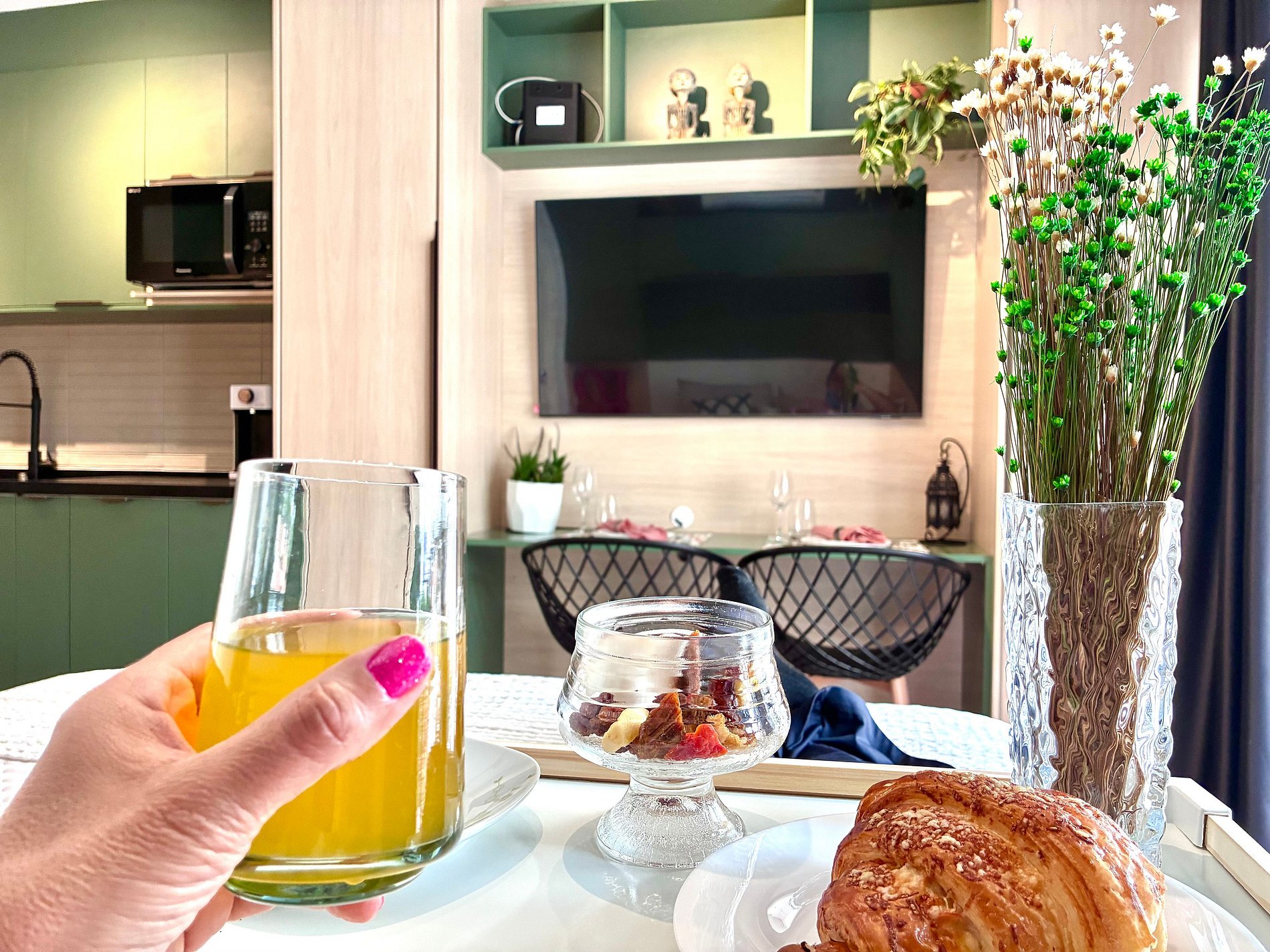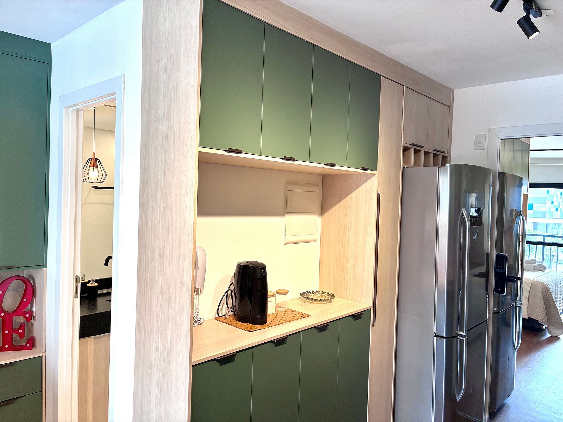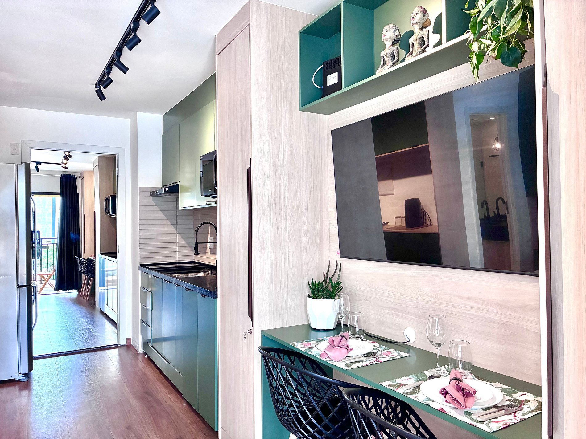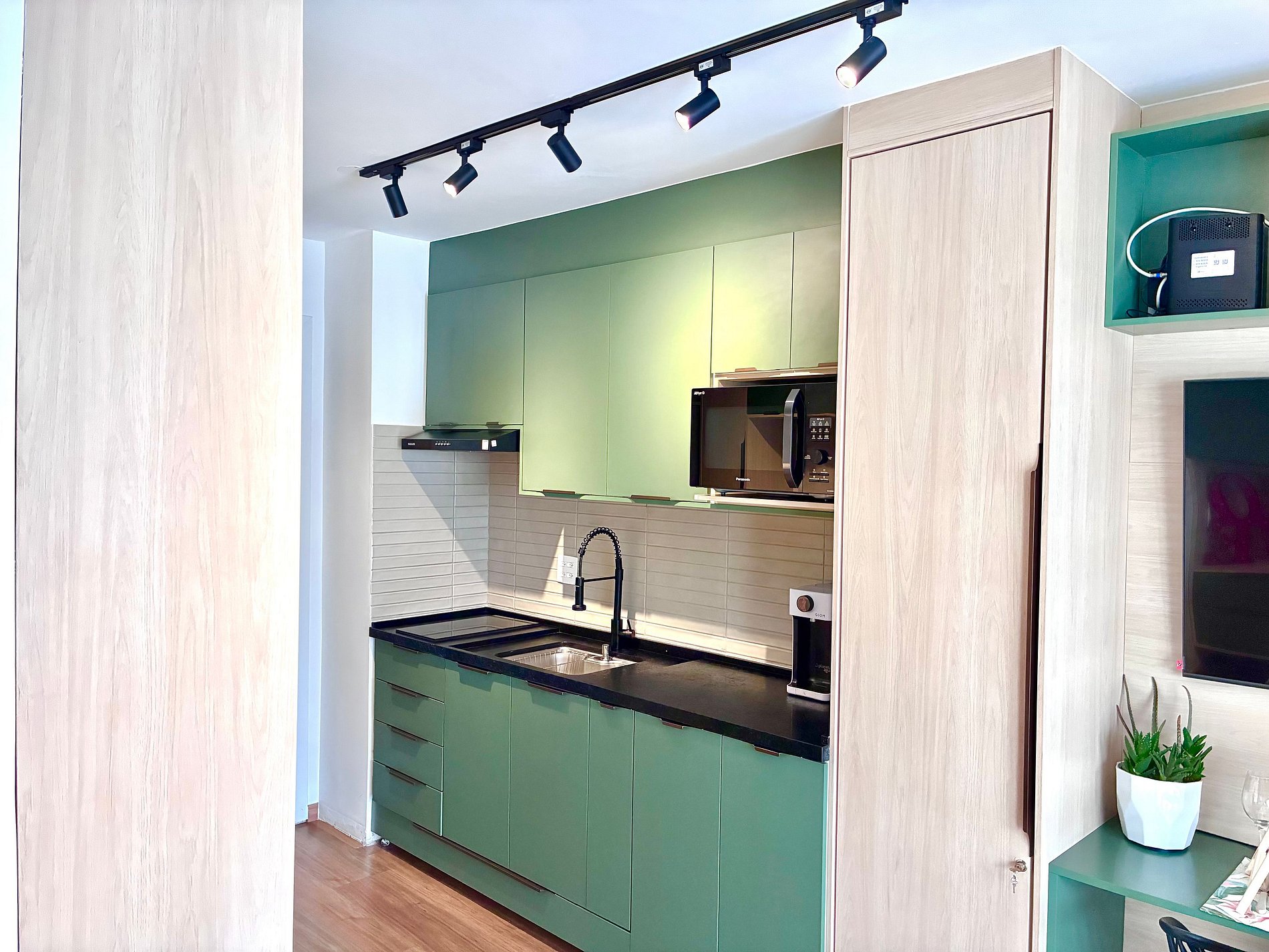 Cozinha completa com Air Fryer, micro-ondas e utensílios.