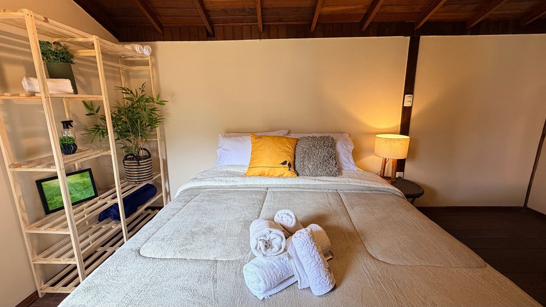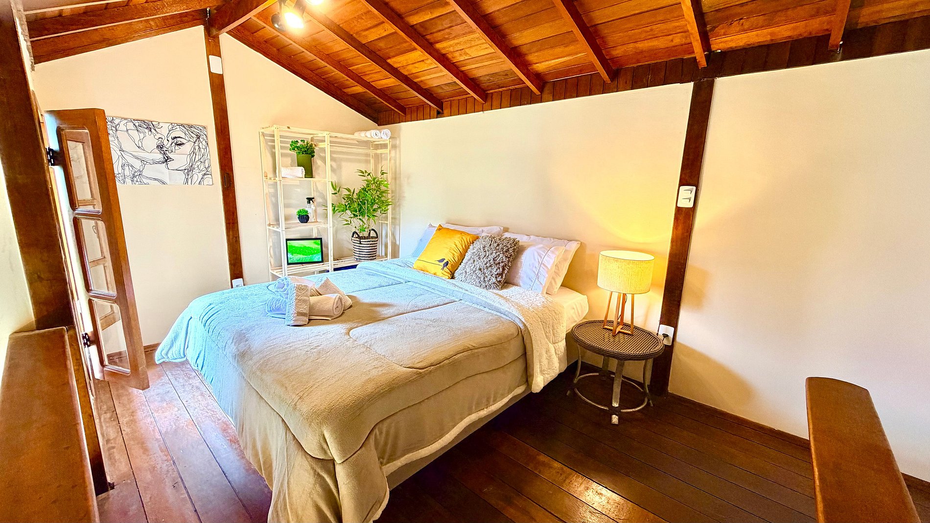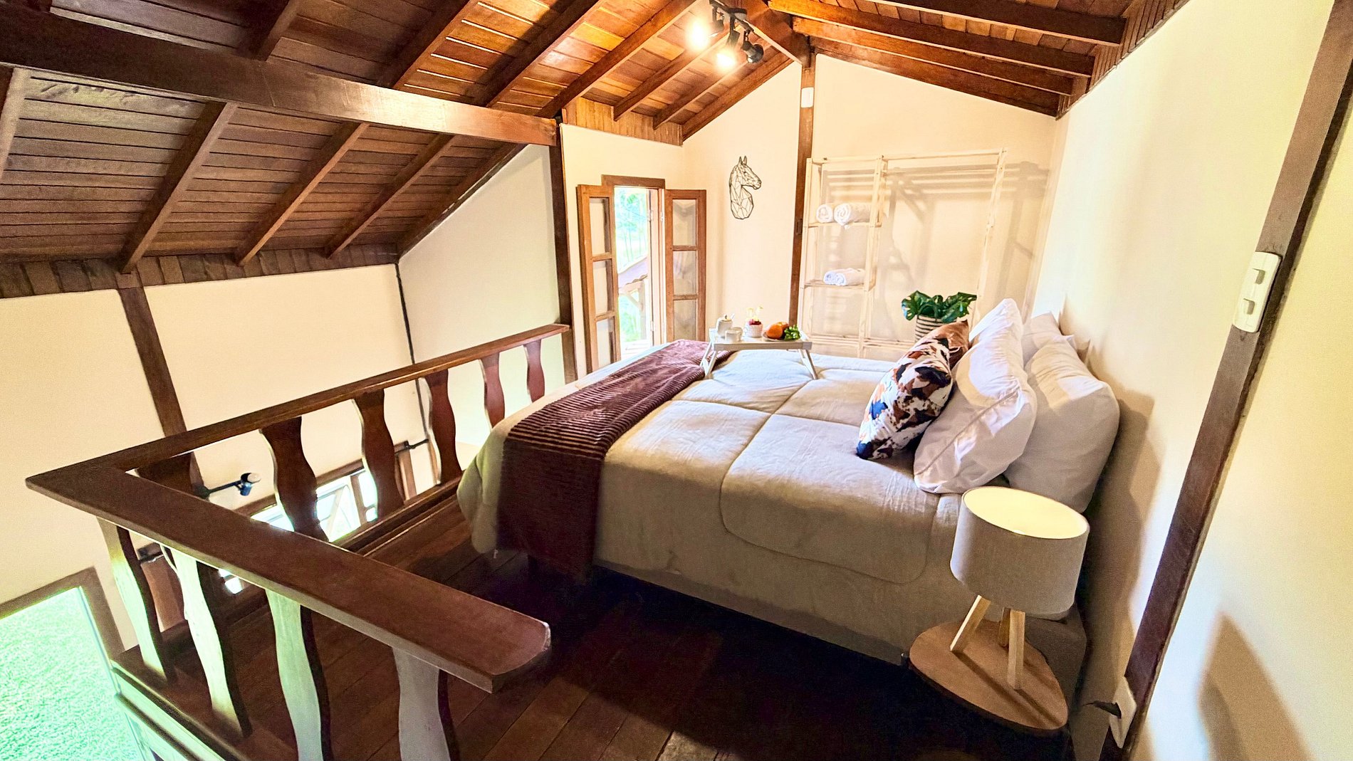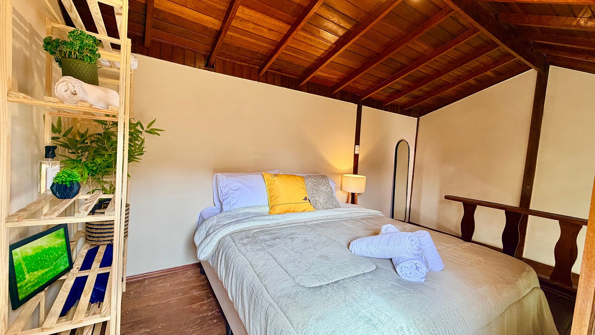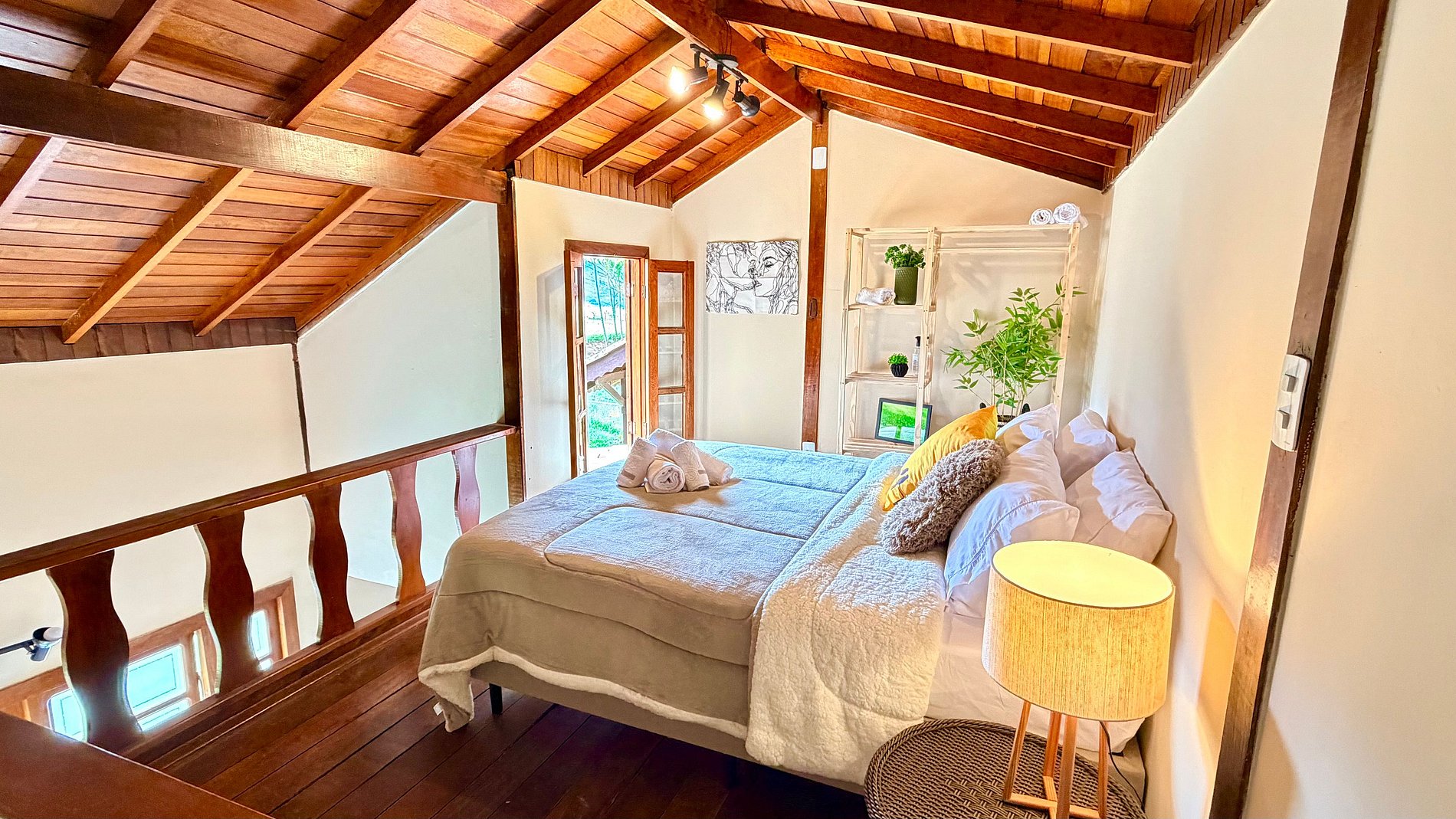 Ambiente Aconchegante: O mezanino conta com uma cama Queen ampla e confortável, garantindo noites de sono tranquilas e revigorantes.