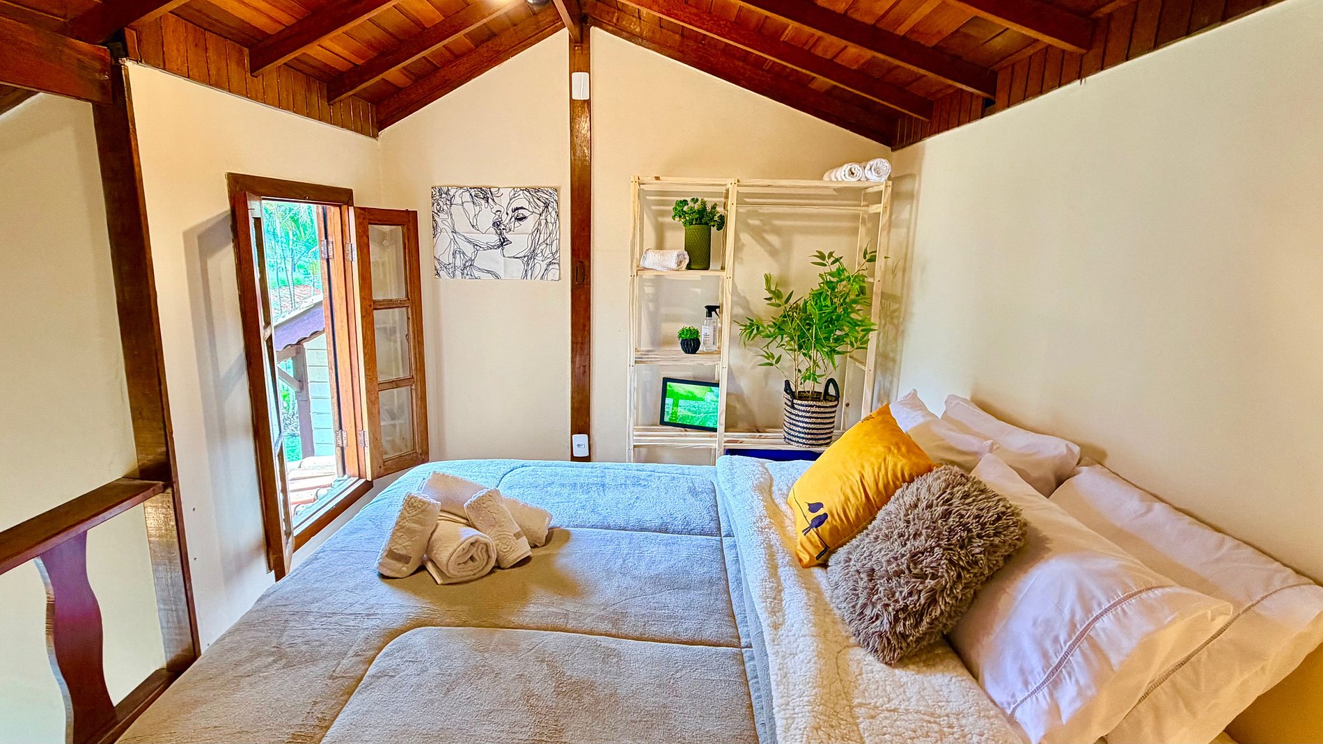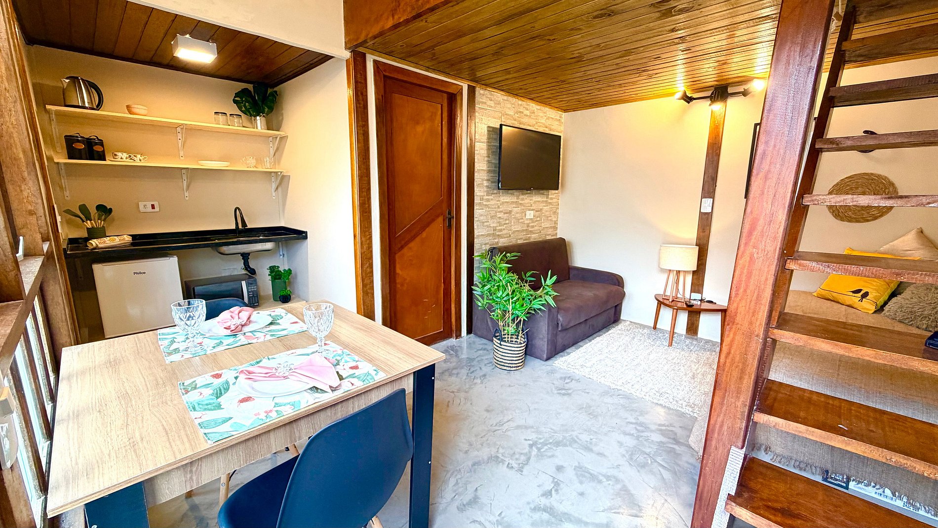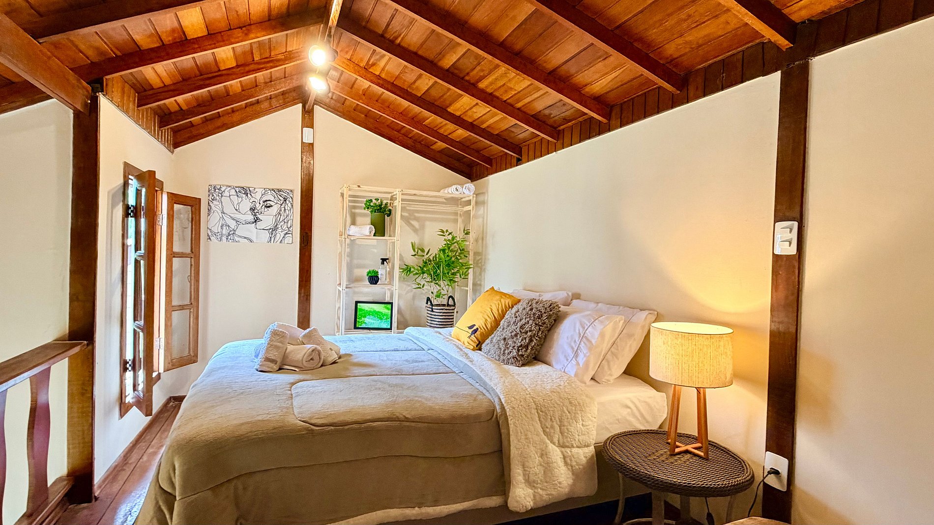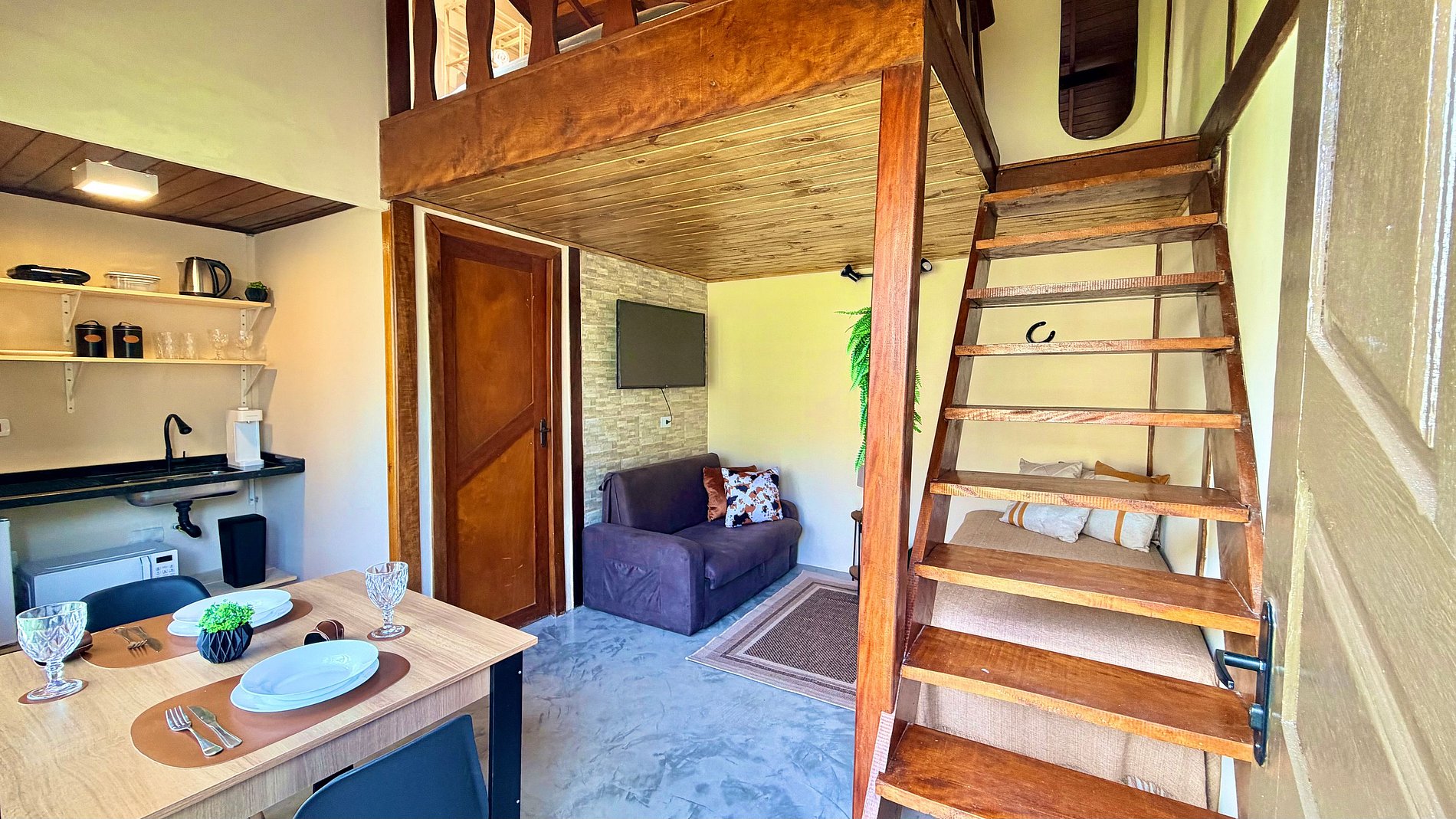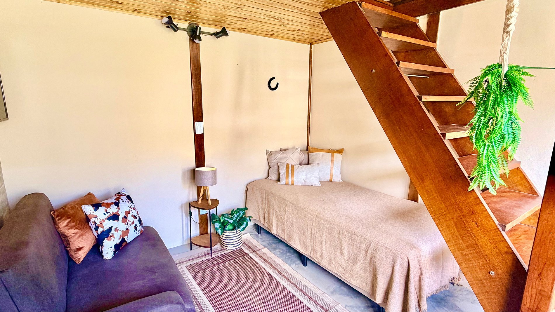 Ambiente Aconchegante: O mezanino conta com uma cama Queen ampla e confortável, garantindo noites de sono tranquilas e revigorantes.