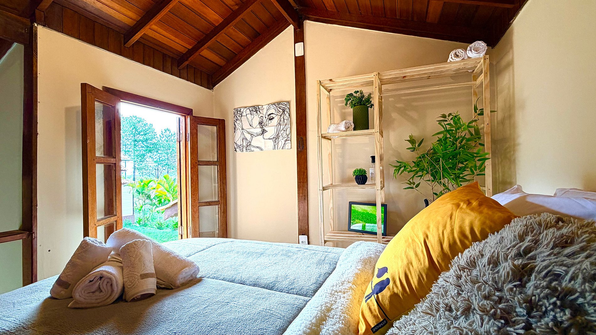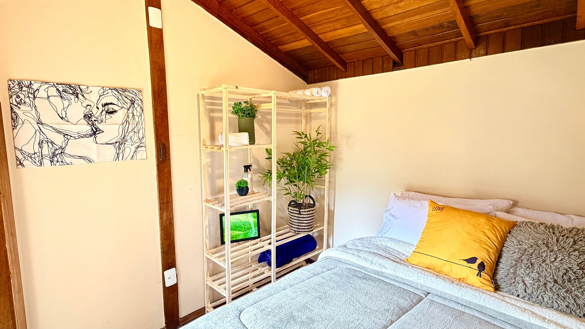 Conectividade e Relaxamento: Smart TV para seus momentos de descanso e uma decoração que valoriza elementos naturais, proporcionando uma atmosfera de paz e acolhimento.