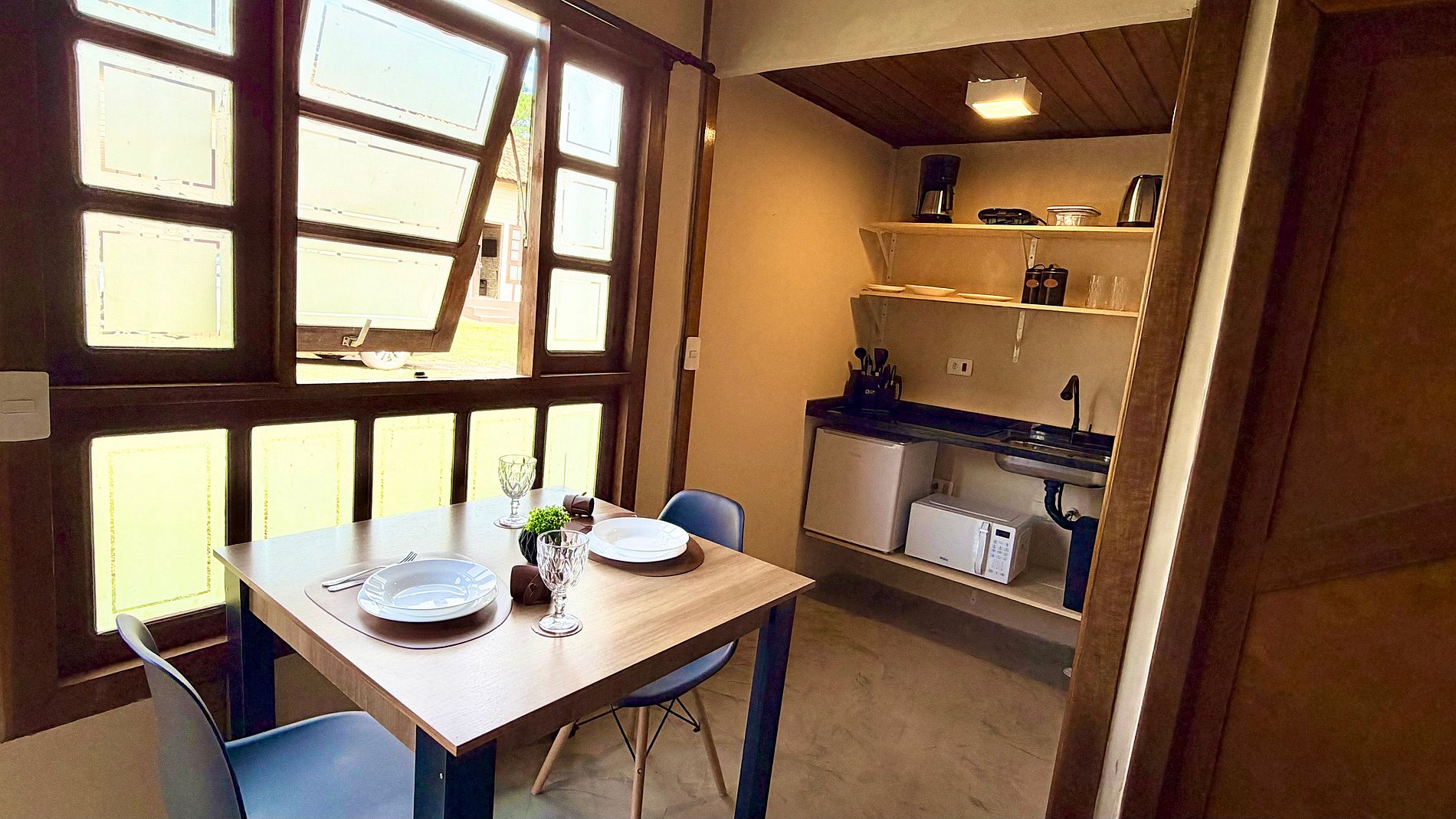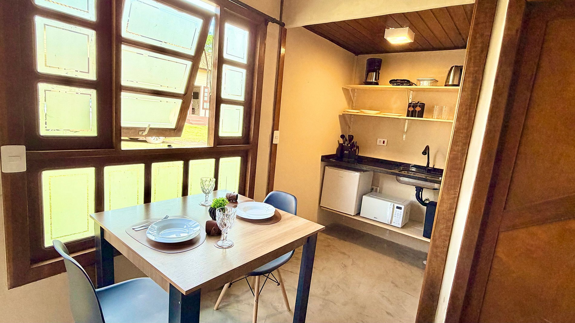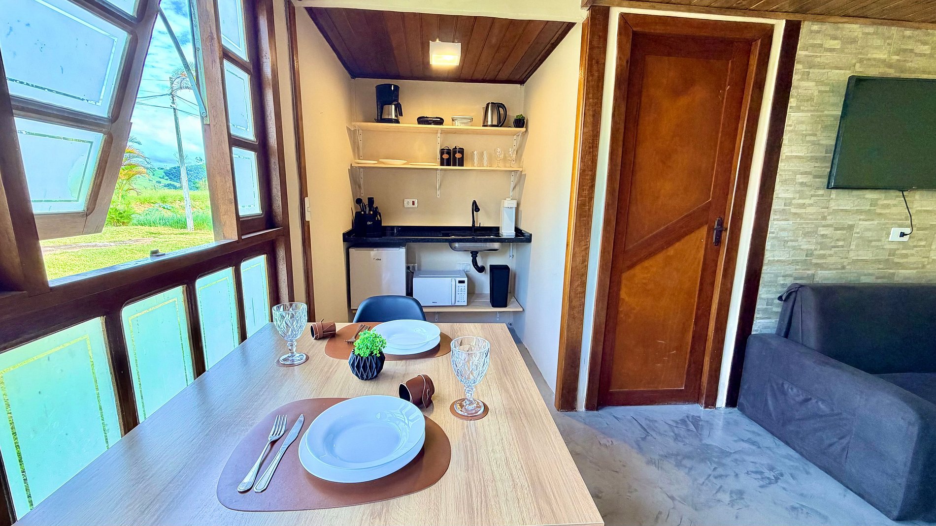 Praticidade: Cozinha equipada com frigobar, micro-ondas, cafeteira e utensílios necessários para preparar suas refeições.