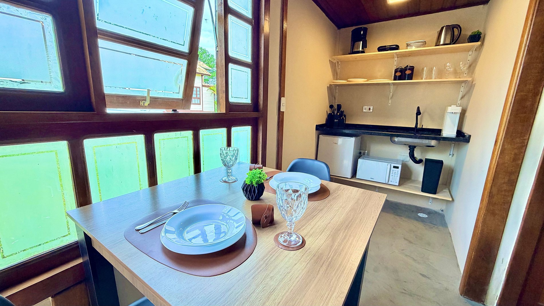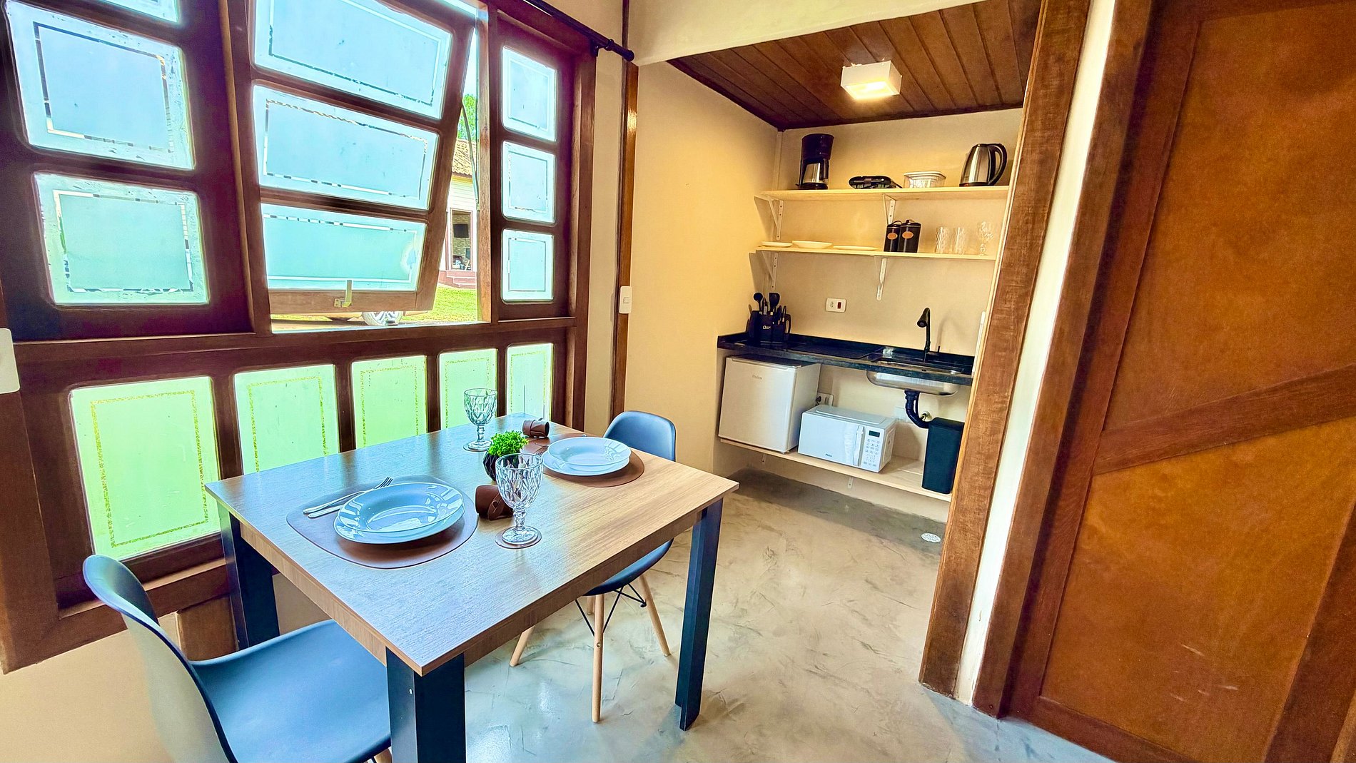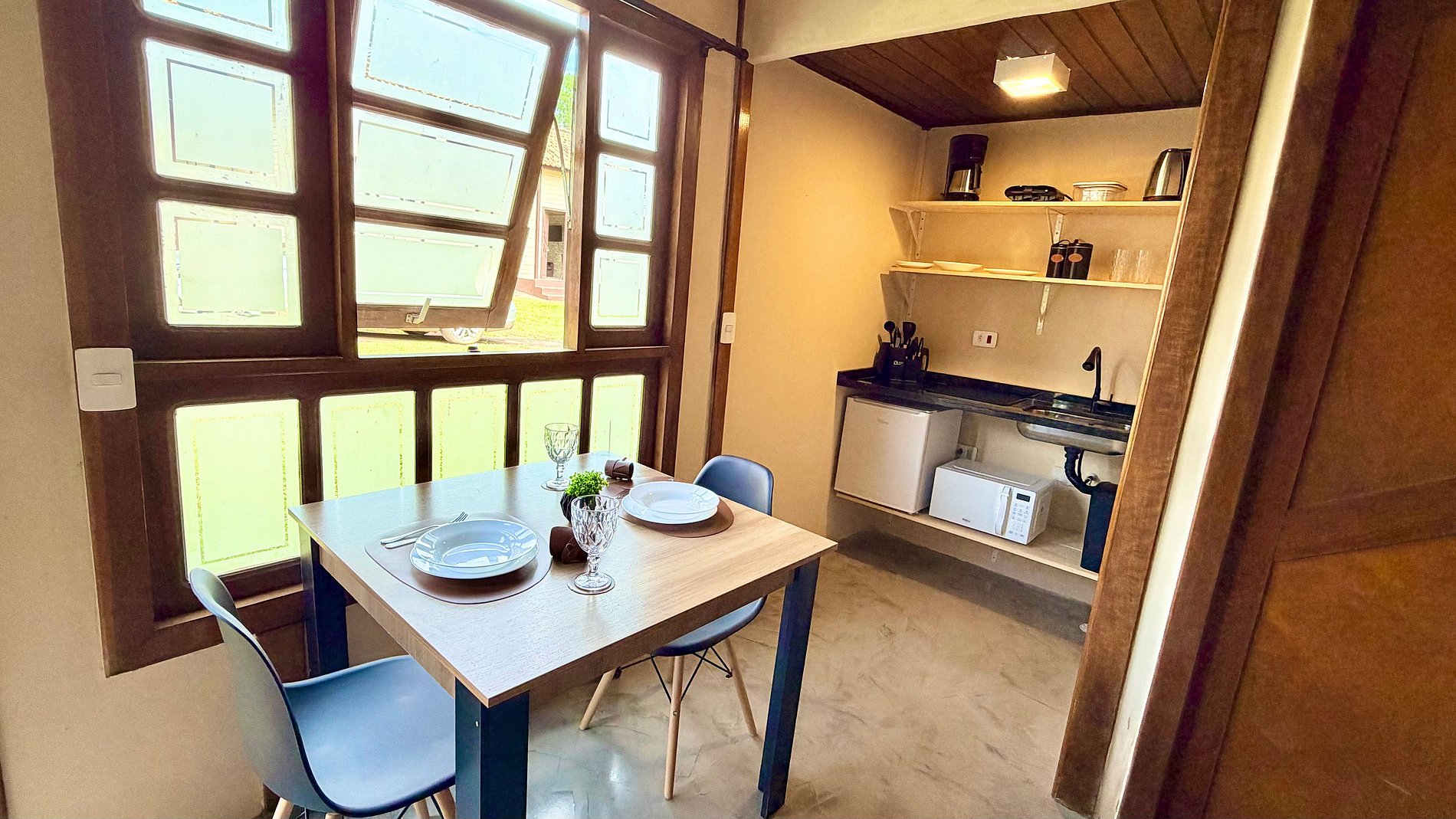 Praticidade: Cozinha equipada com frigobar, micro-ondas, cafeteira e utensílios necessários para preparar suas refeições.