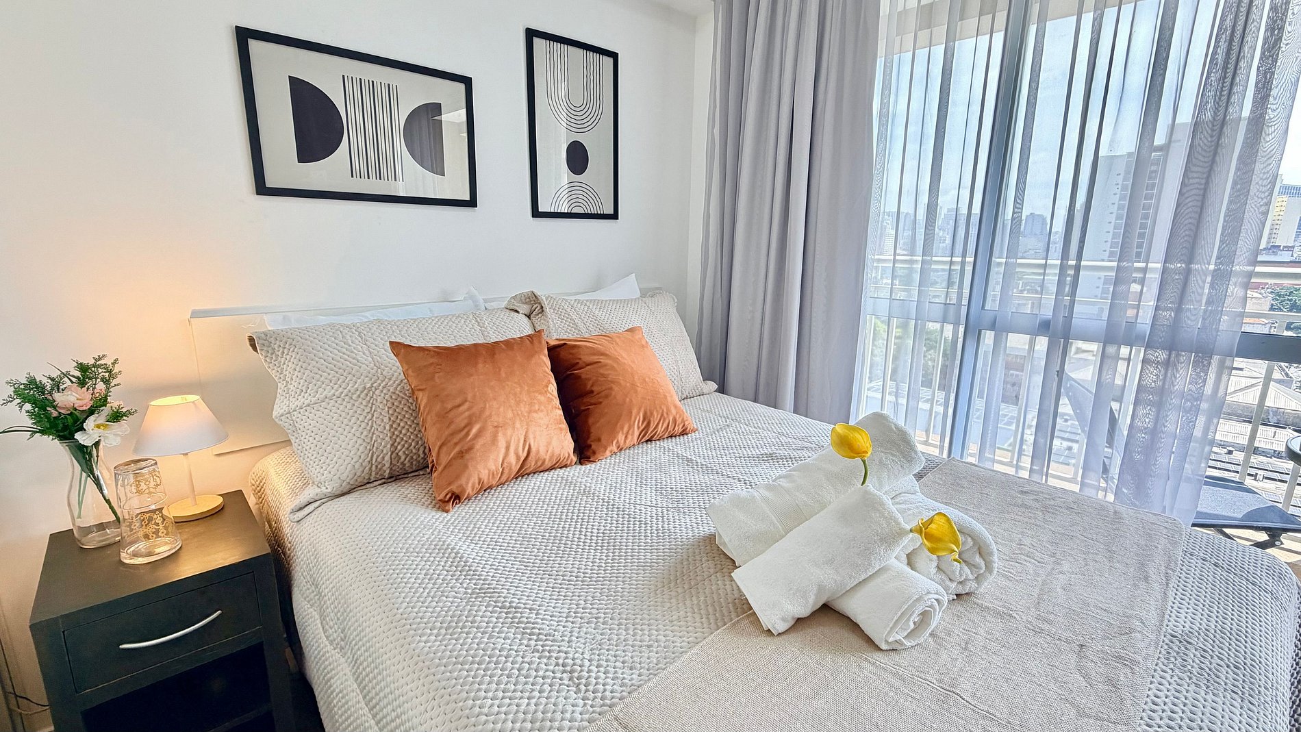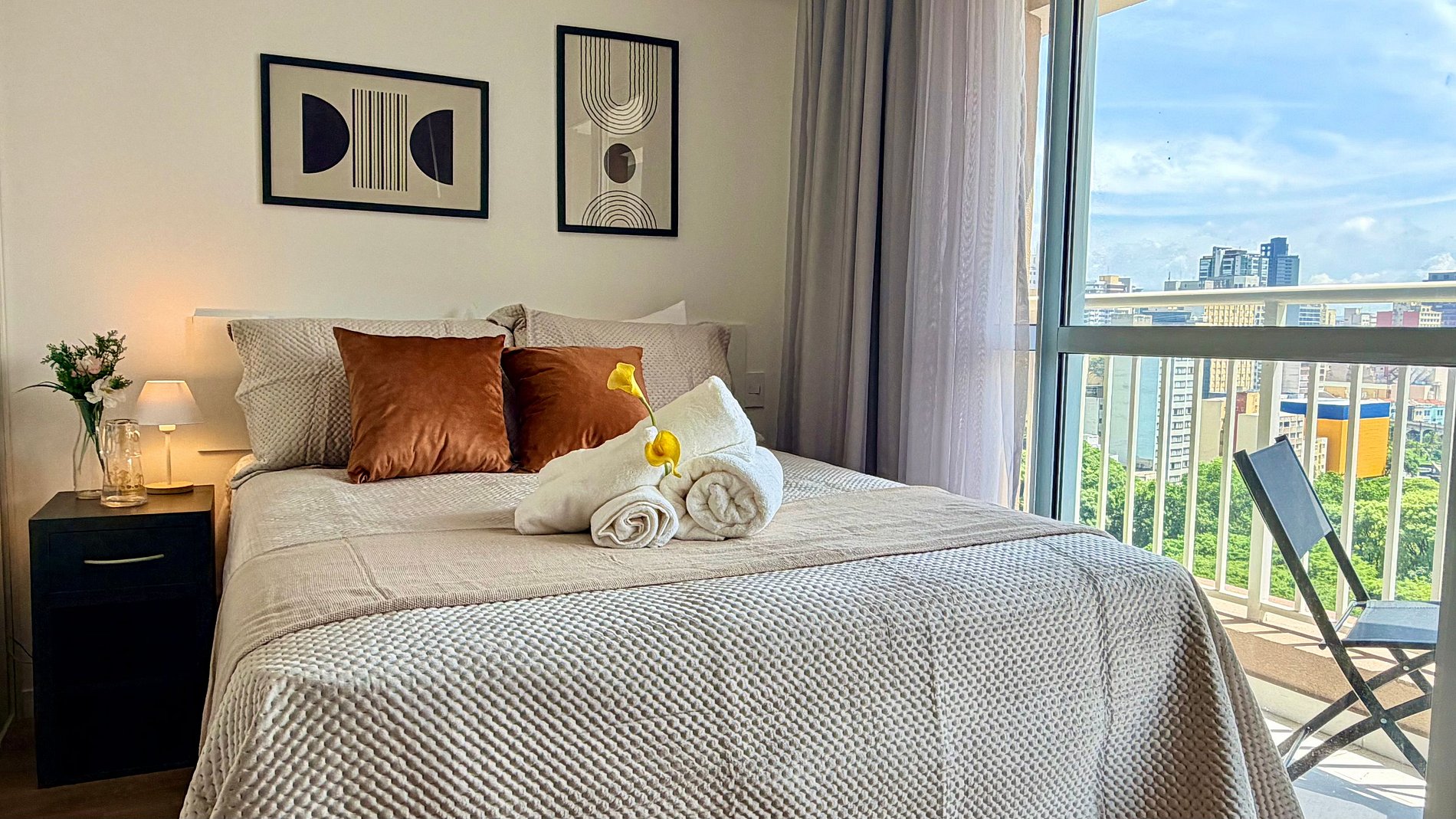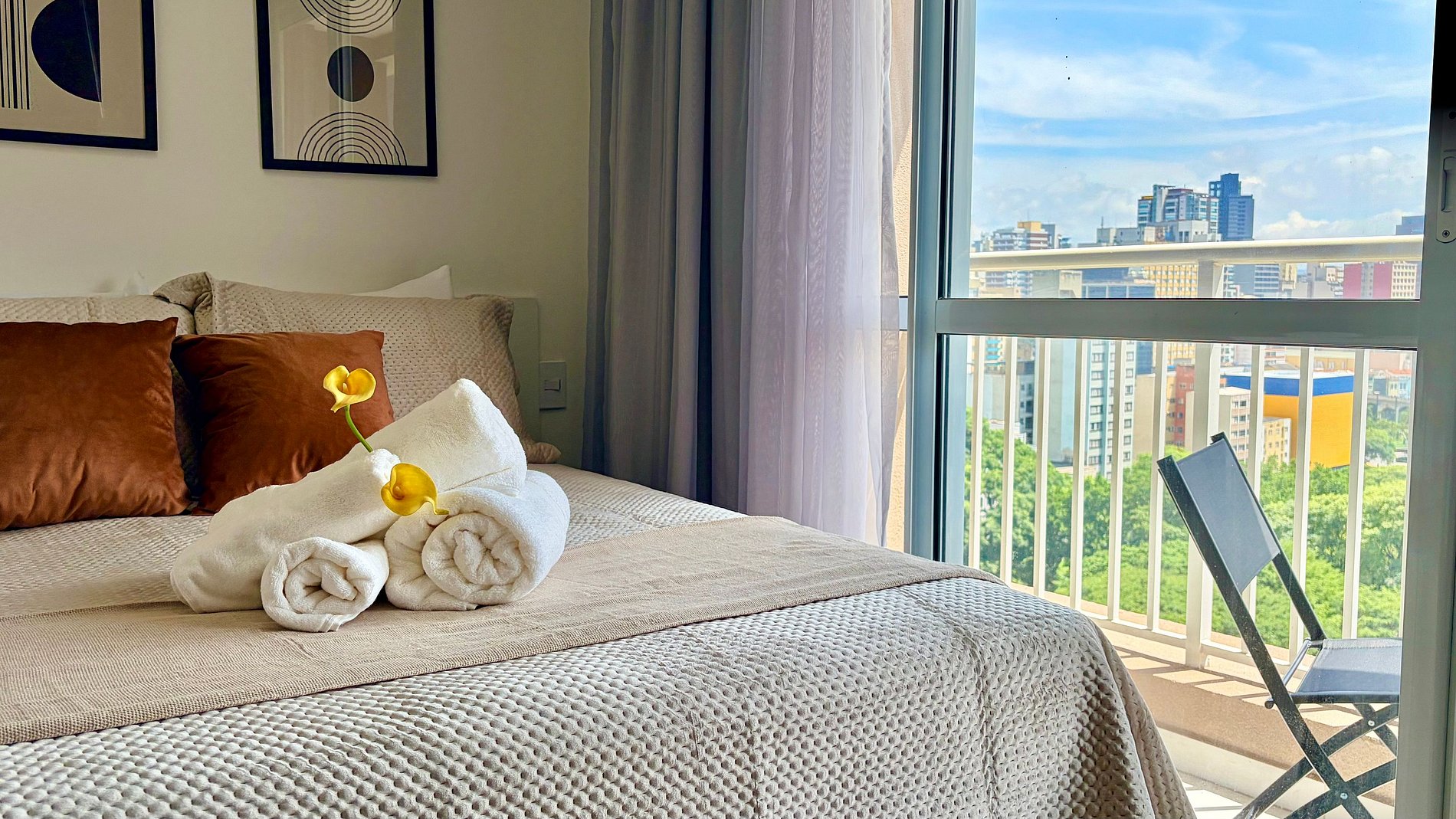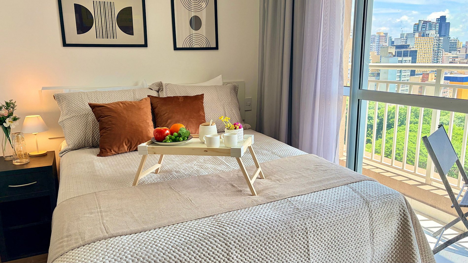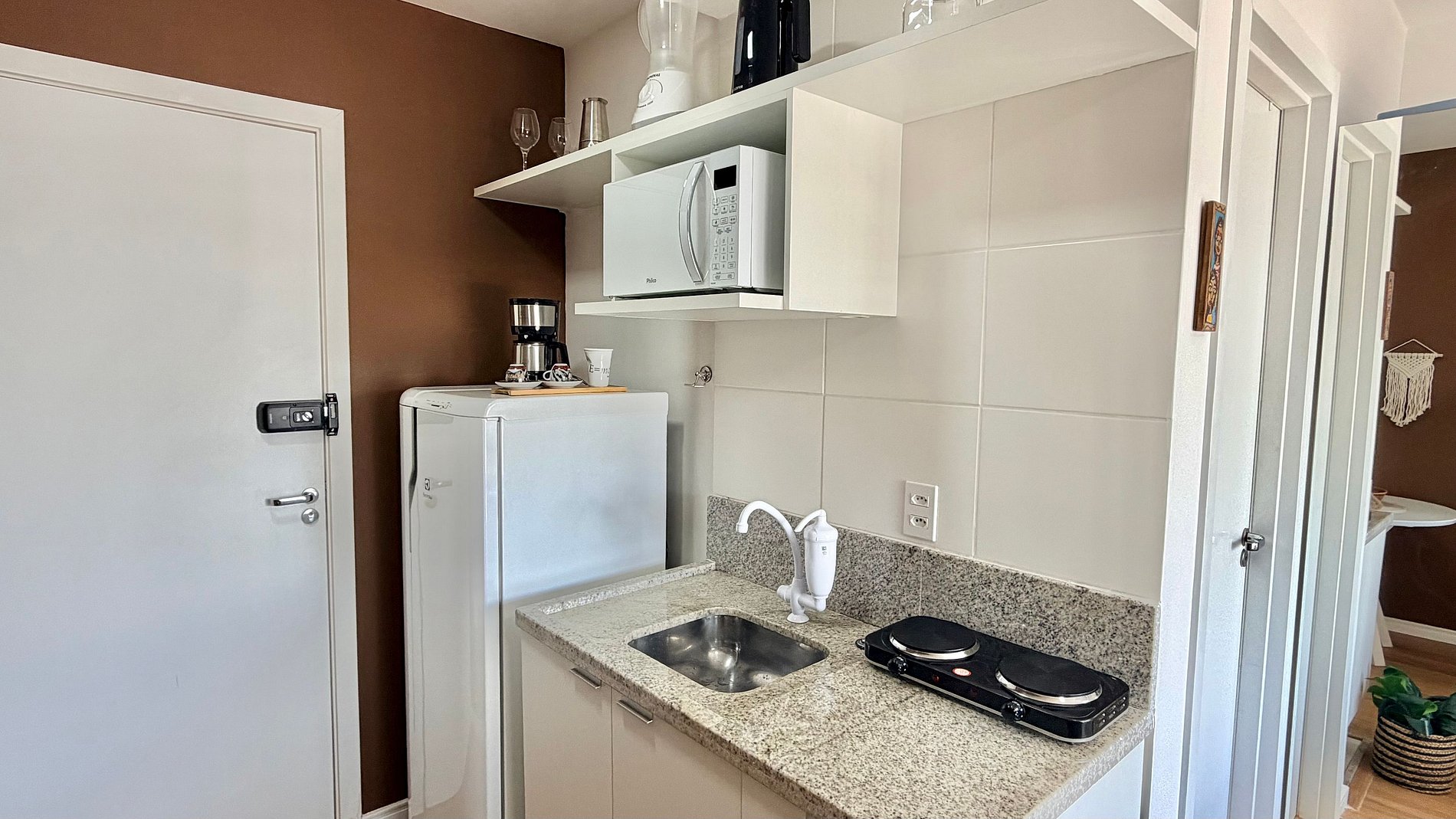 ESTRUTURA COMPLETA: Prédio moderno com TV Smart, cozinha completa, roupa de cama e banho, Rooftop, Academia, Coworking e Mercado no térreo.
