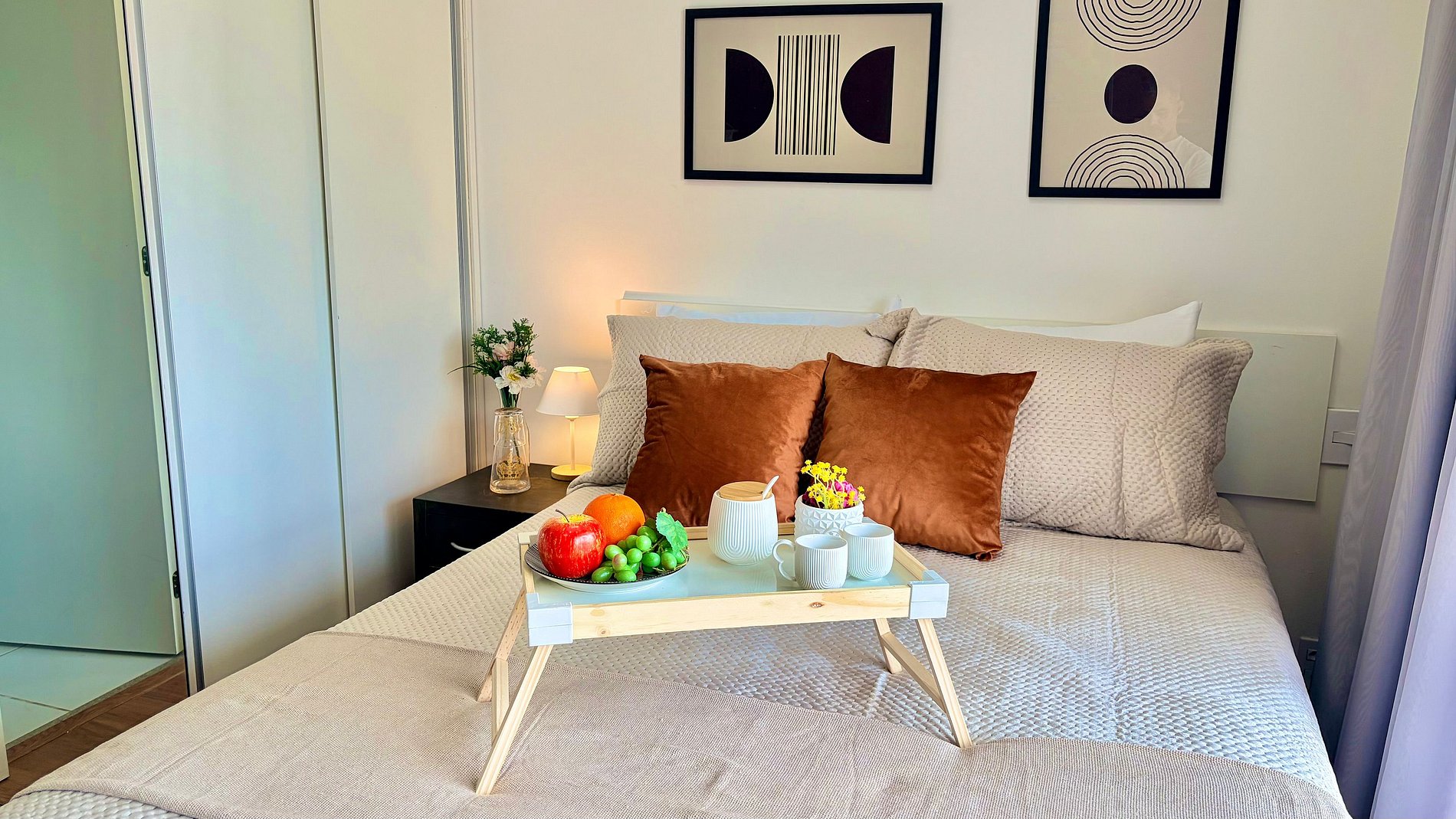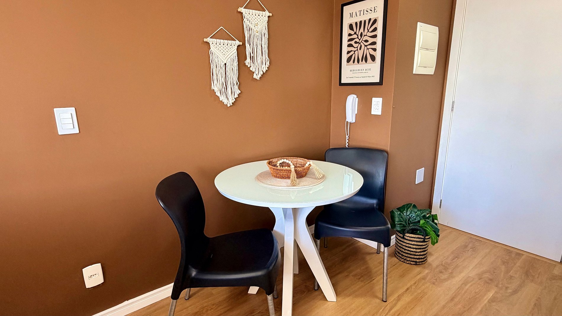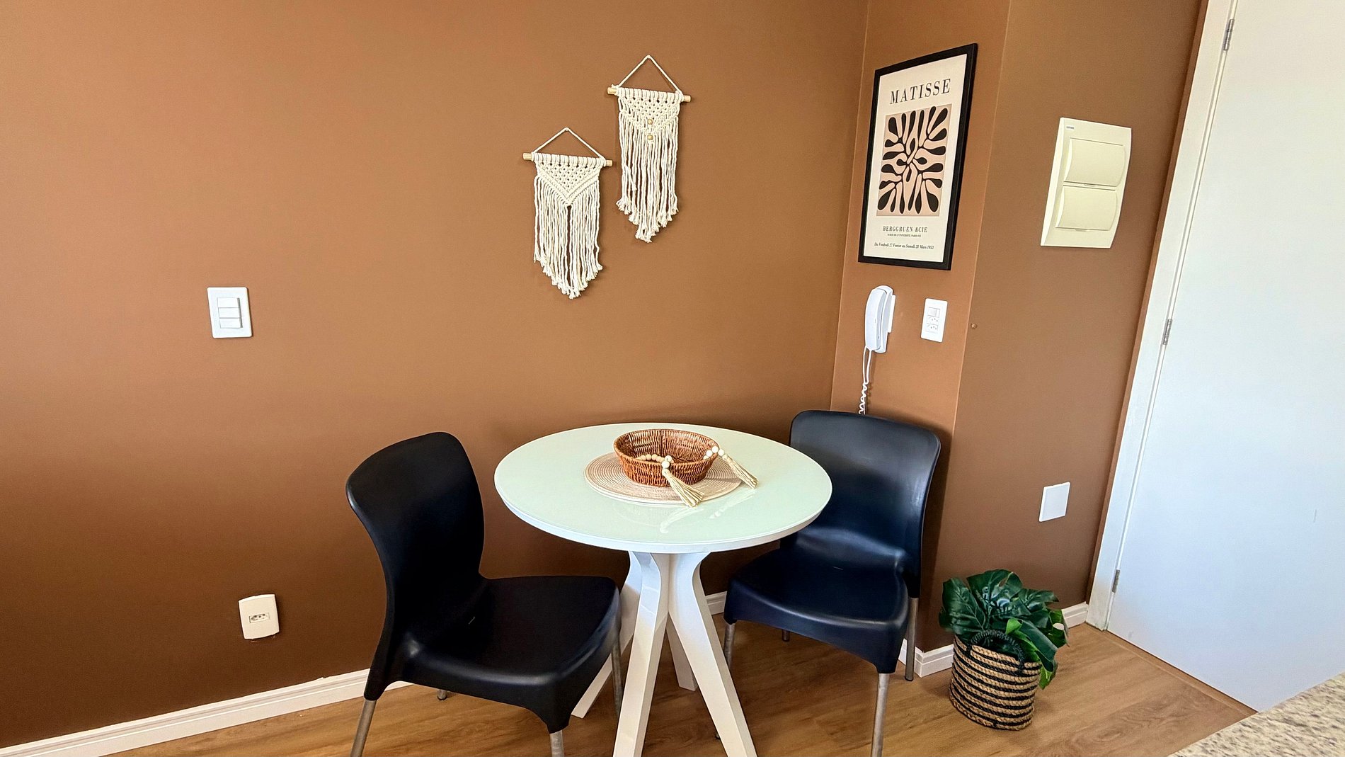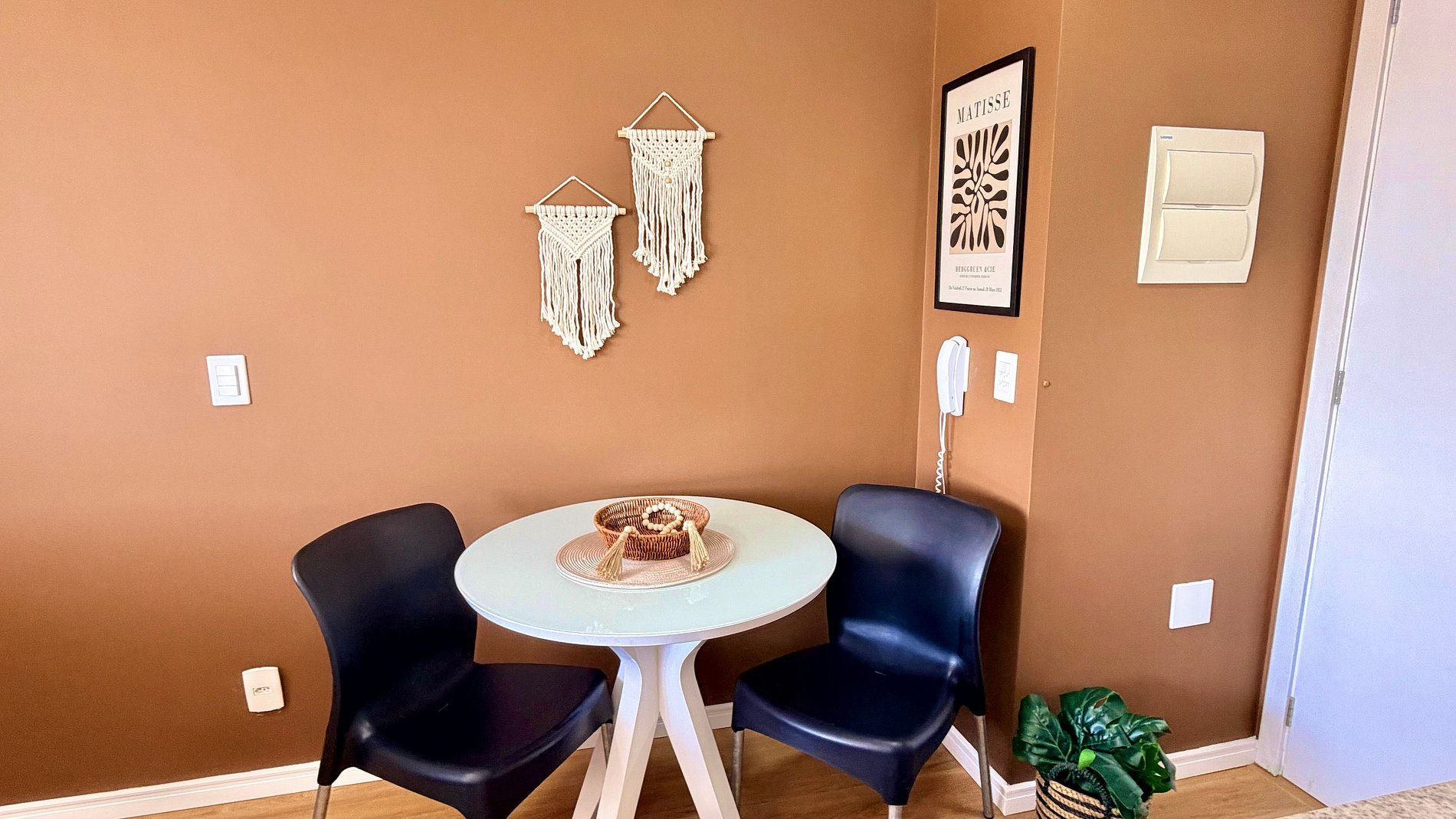 Nosso estúdio foi decorado com tons terrosos e texturas naturais para criar um refúgio acolhedor e cheio de personalidade para sua estadia em São Paulo.
