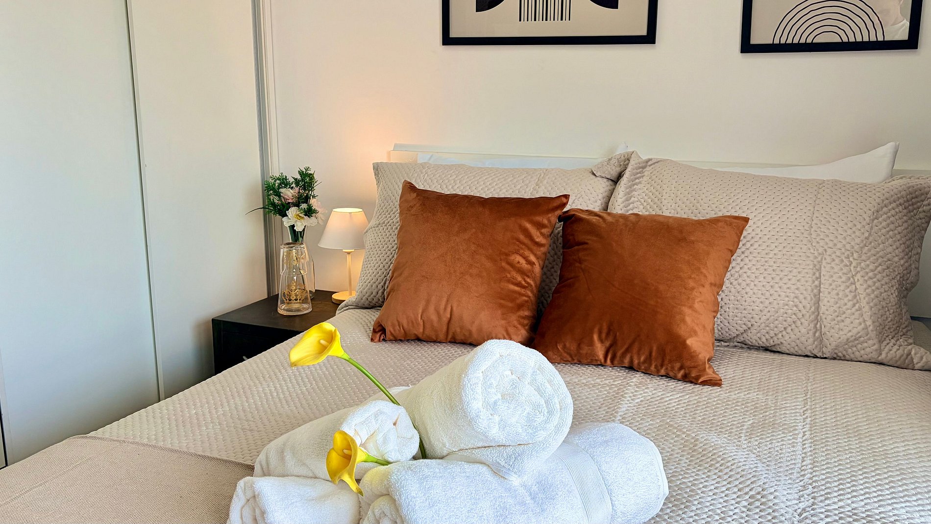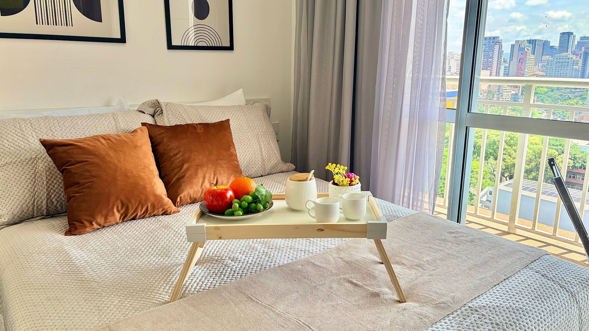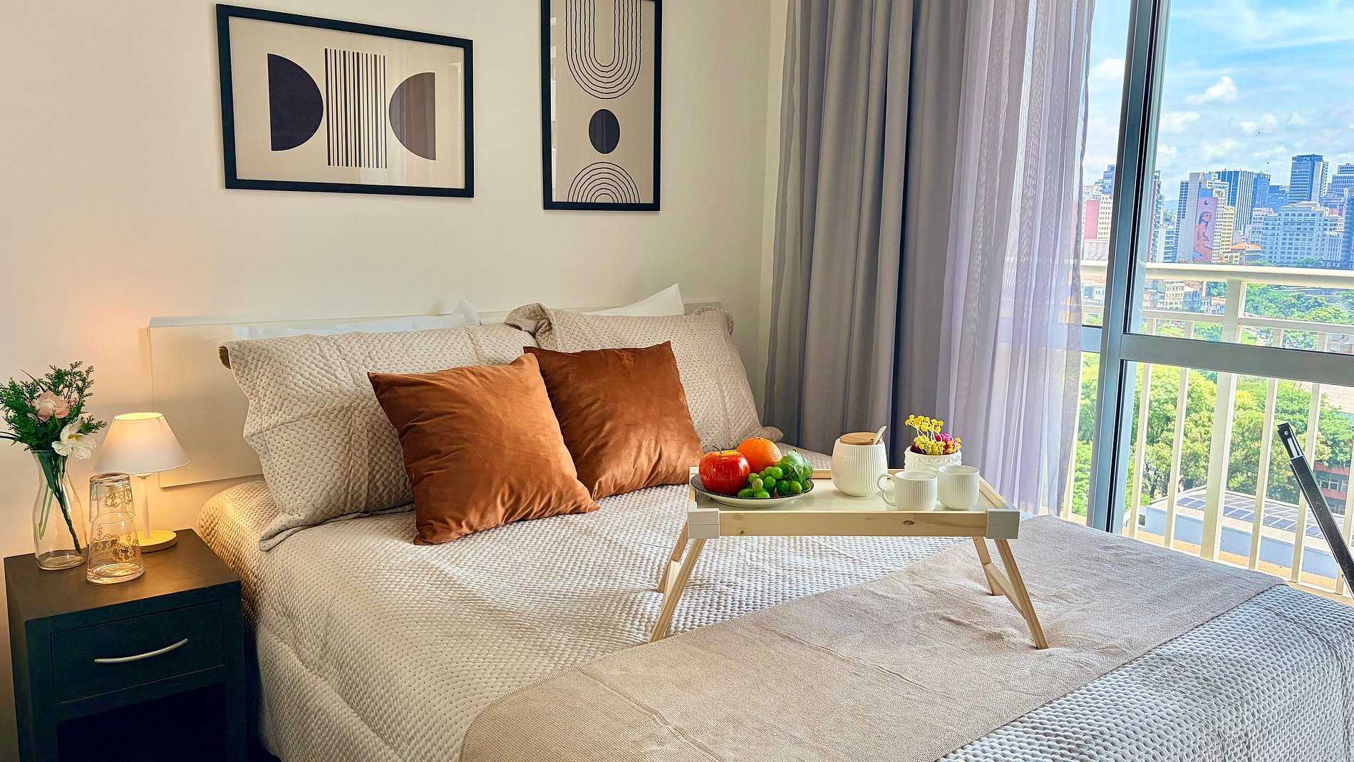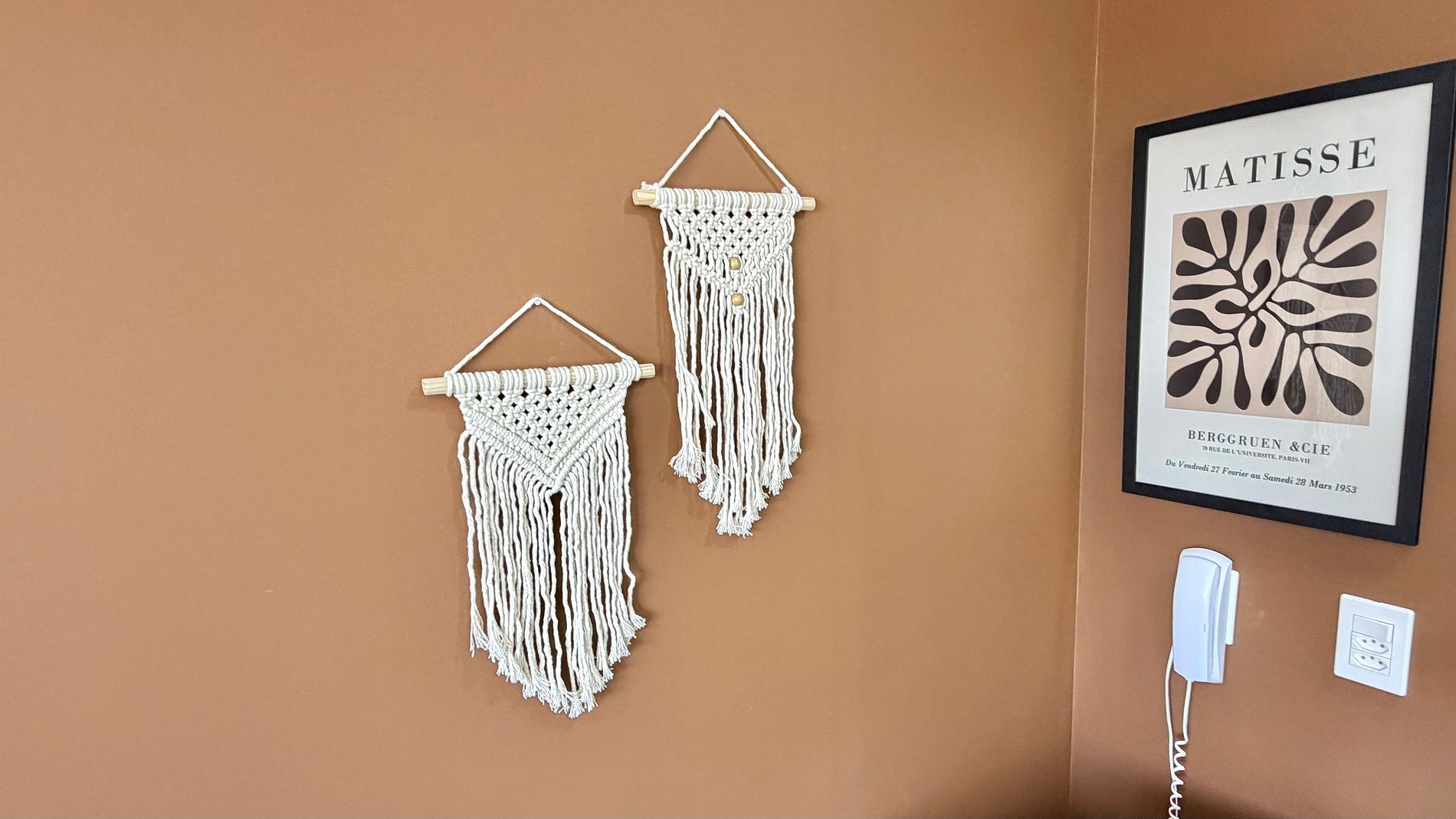 Nosso estúdio foi decorado com tons terrosos e texturas naturais para criar um refúgio acolhedor e cheio de personalidade para sua estadia em São Paulo.