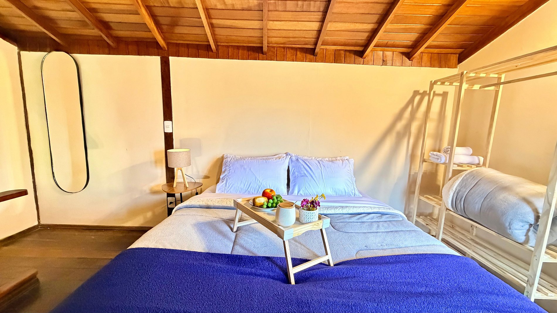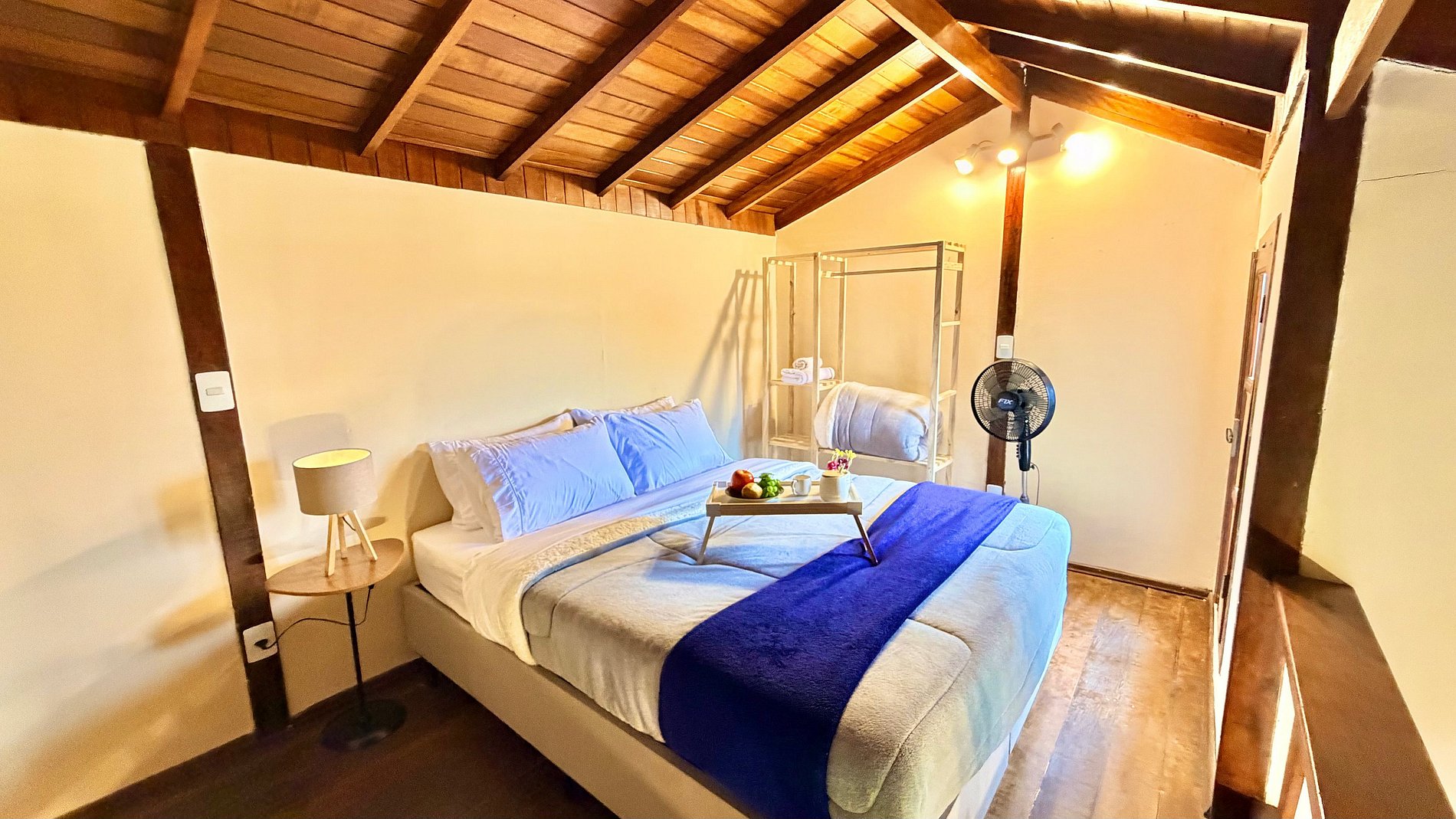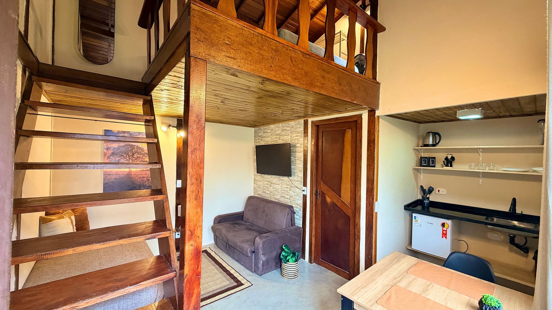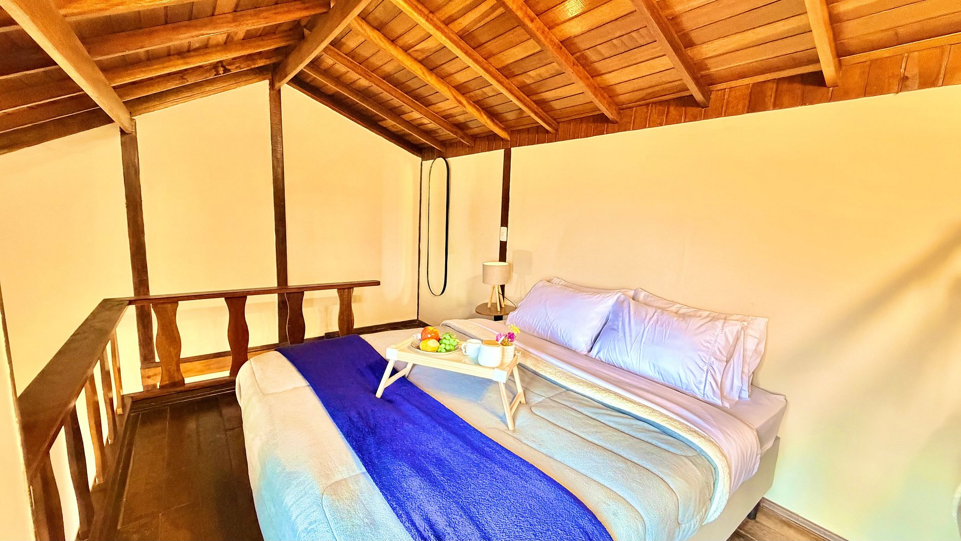 Ambiente Aconchegante: O mezanino conta com uma cama Queen ampla e confortável, garantindo noites de sono tranquilas e revigorantes.