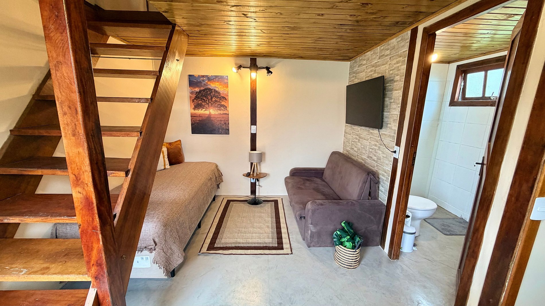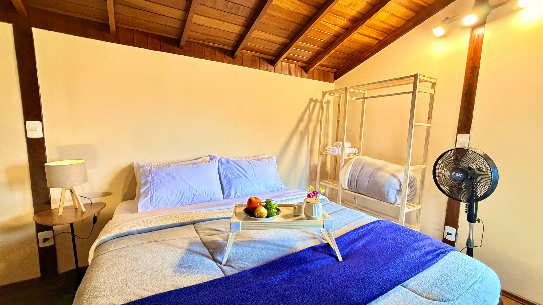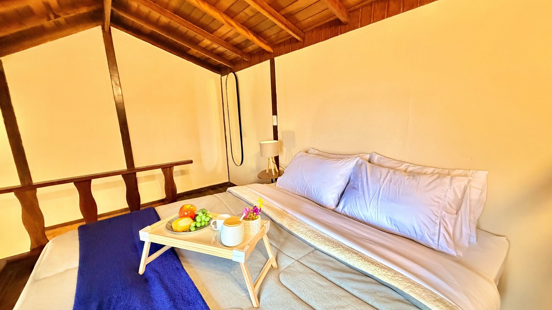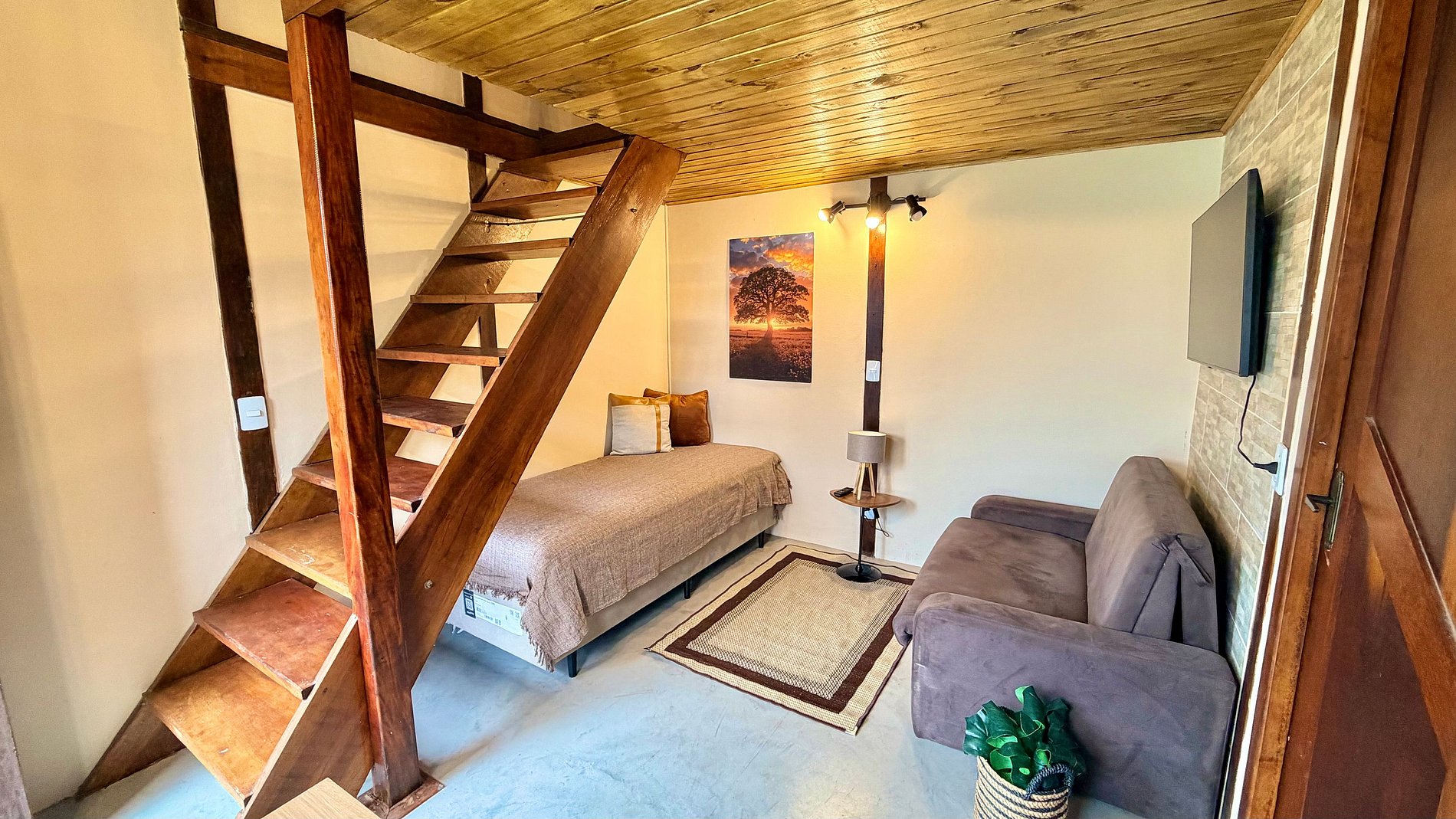 Ambiente Aconchegante: O mezanino conta com uma cama Queen ampla e confortável, garantindo noites de sono tranquilas e revigorantes.