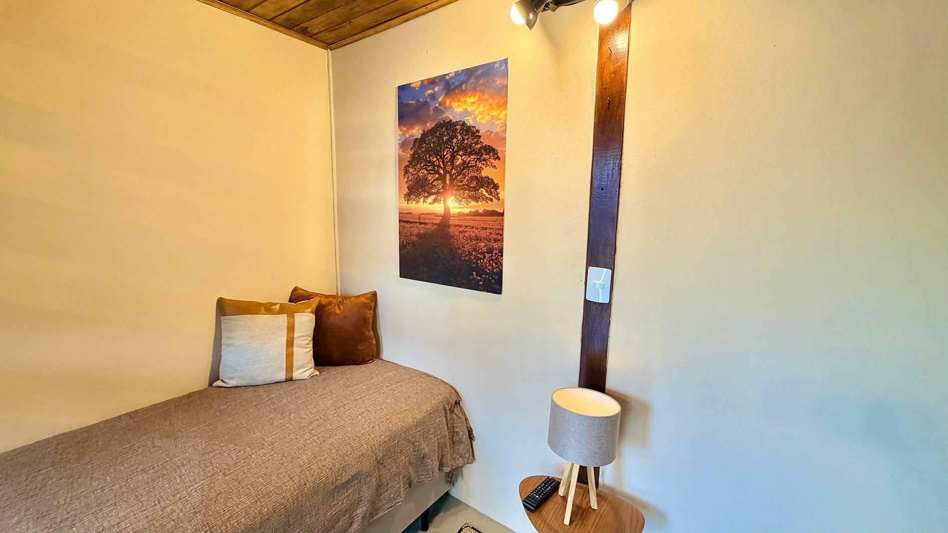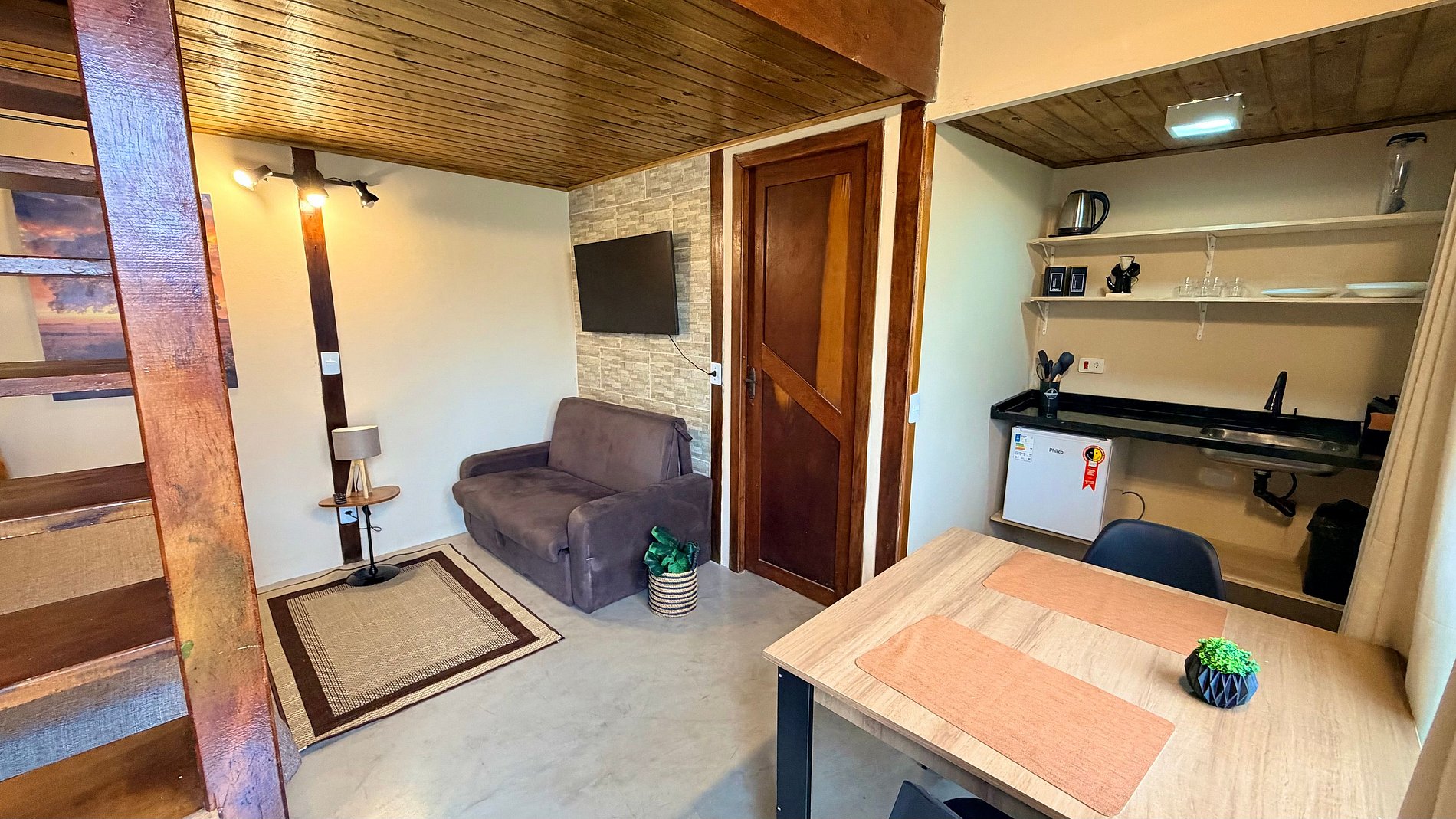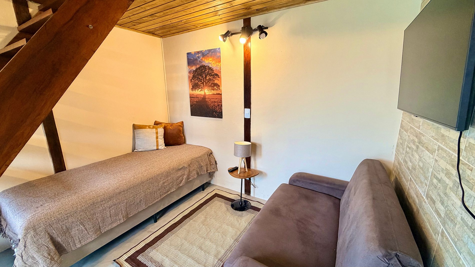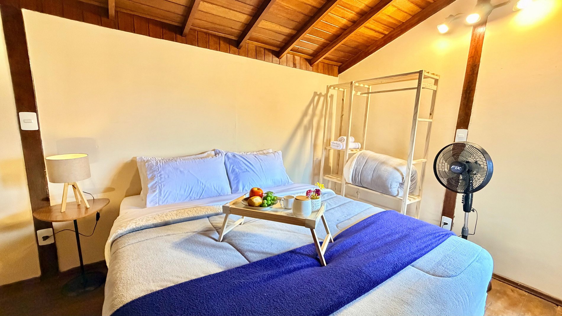 Ambiente Aconchegante: O mezanino conta com uma cama Queen ampla e confortável, garantindo noites de sono tranquilas e revigorantes.
