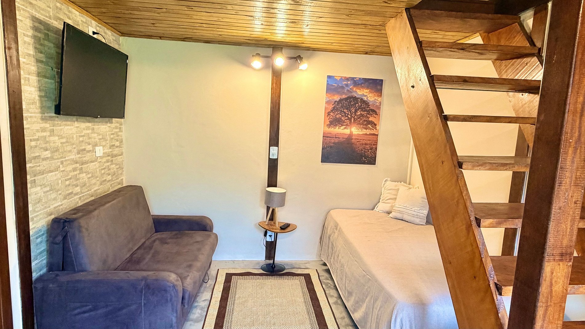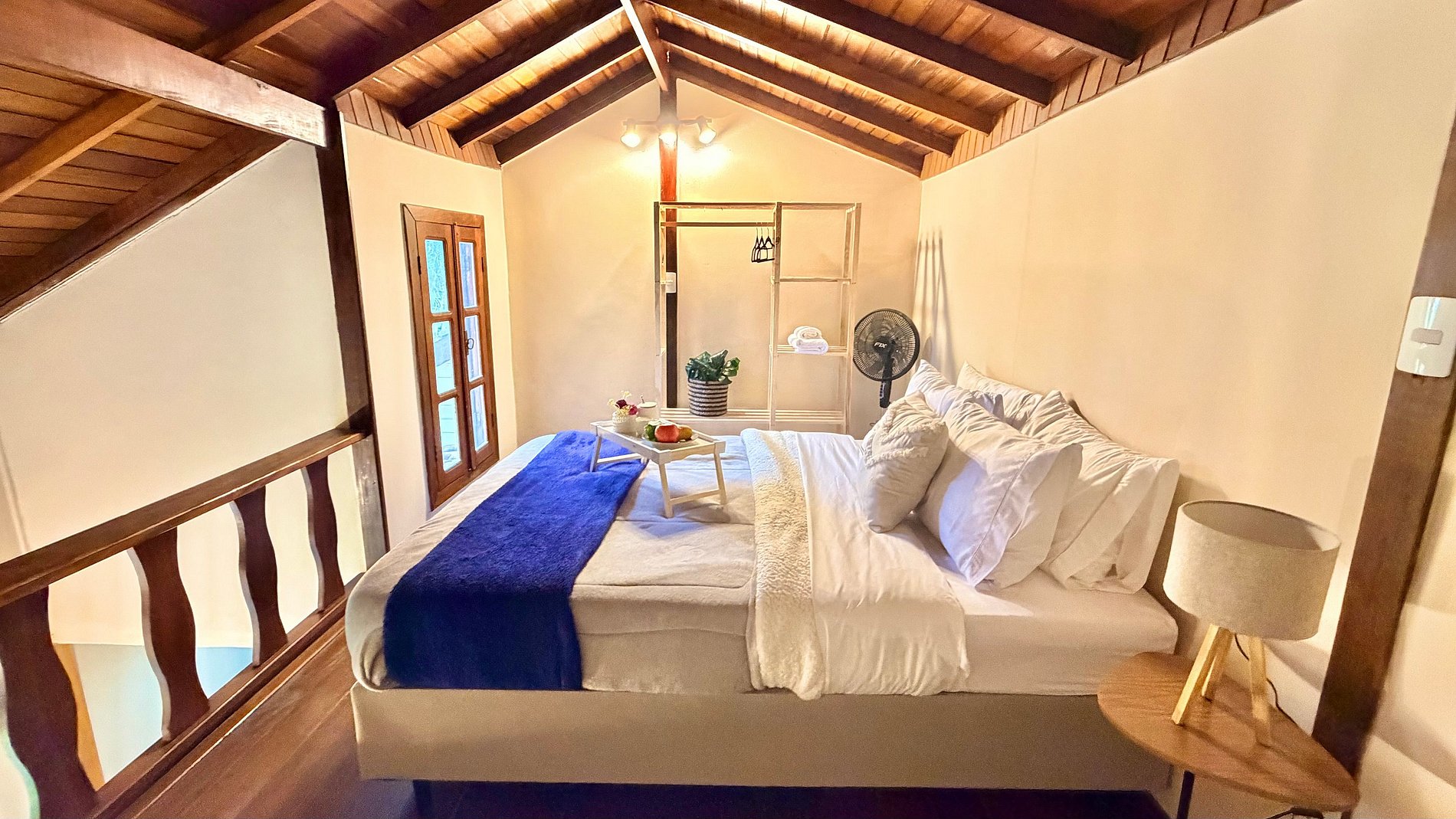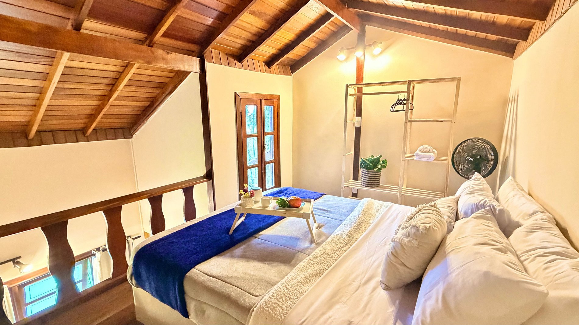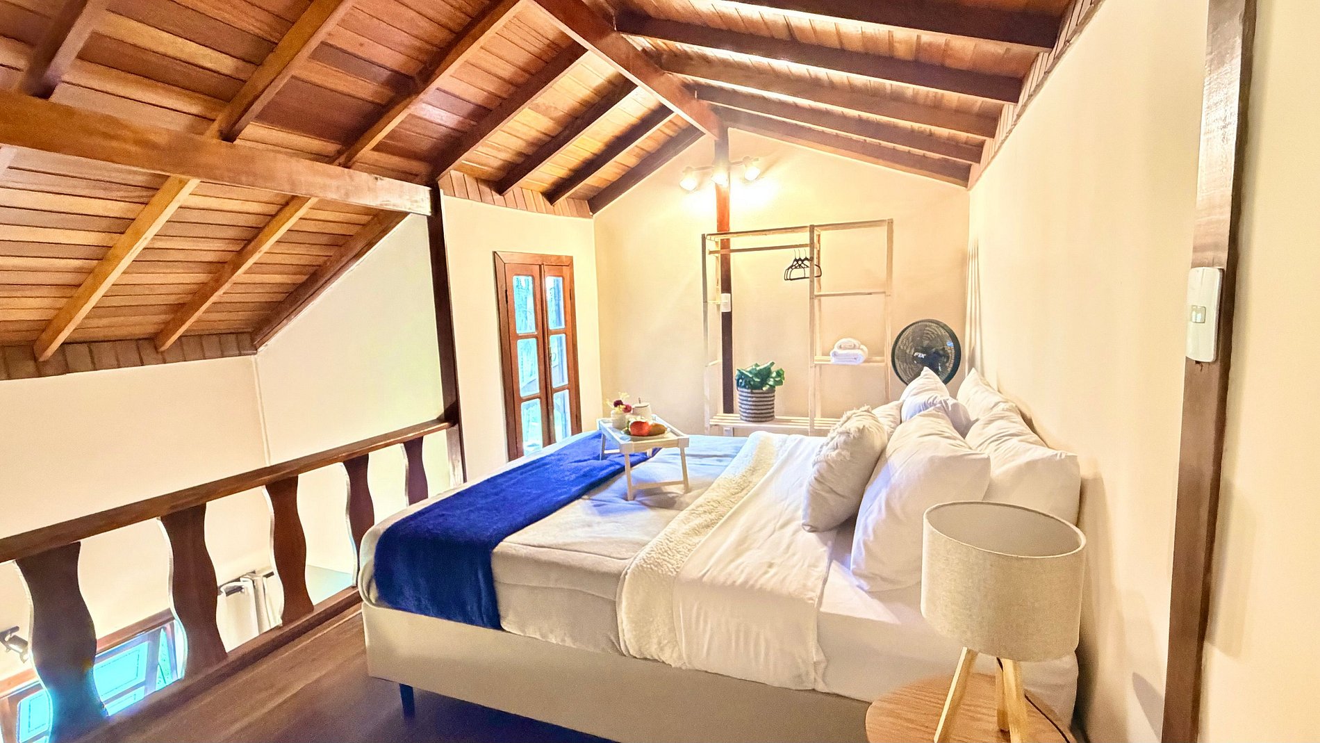 Ambiente Aconchegante: O mezanino conta com uma cama Queen ampla e confortável, garantindo noites de sono tranquilas e