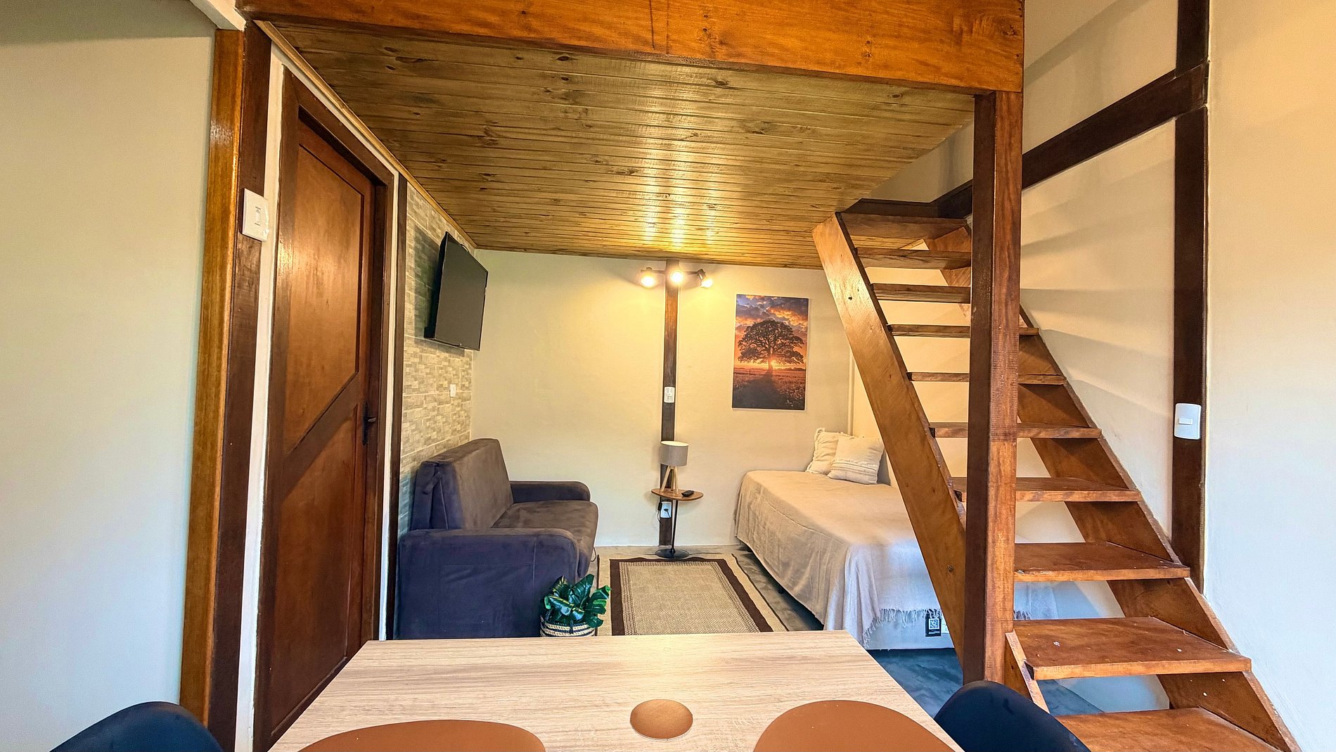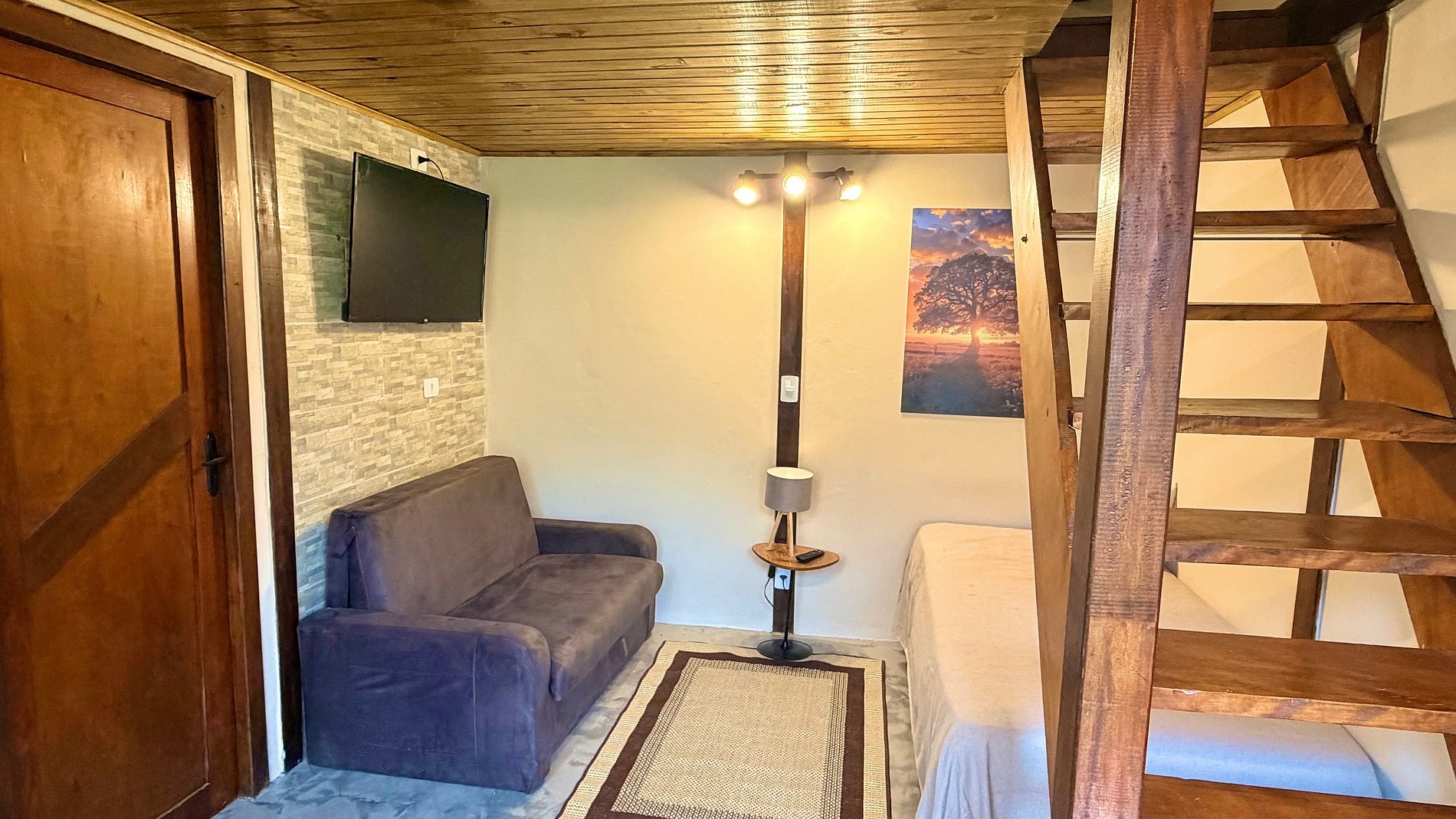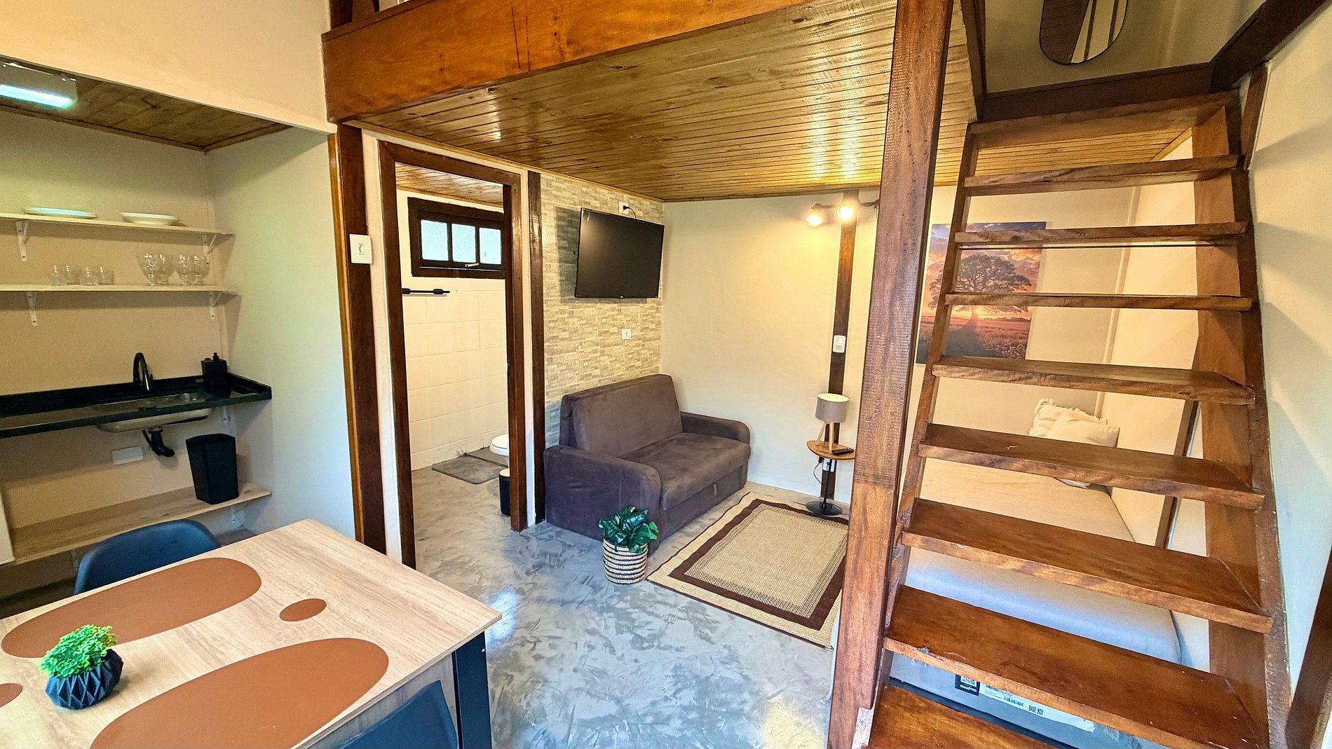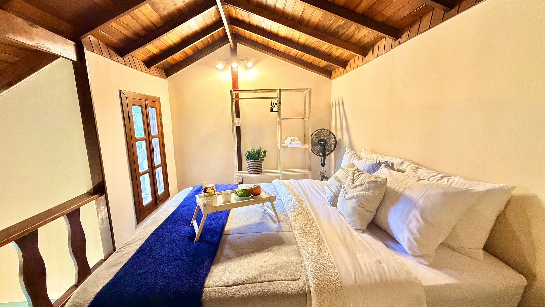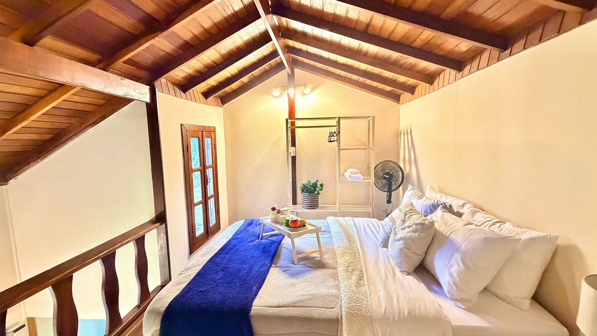 Ambiente Aconchegante: O mezanino conta com uma cama Queen ampla e confortável, garantindo noites de sono tranquilas e