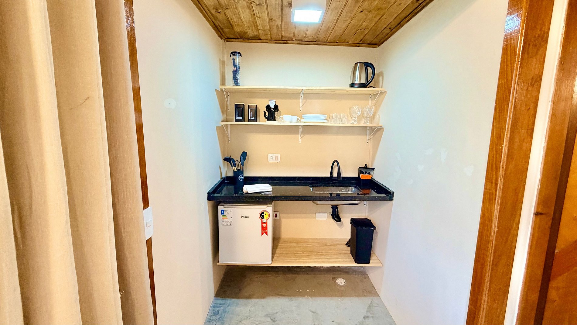 Praticidade: Cozinha equipada com frigobar, micro-ondas e todos os utensílios necessários para preparar suas refeições com praticidade.