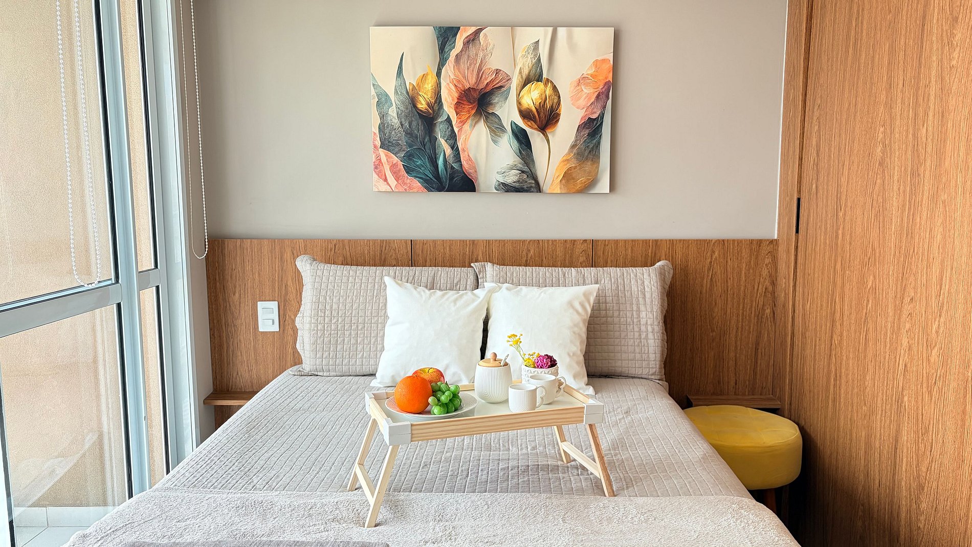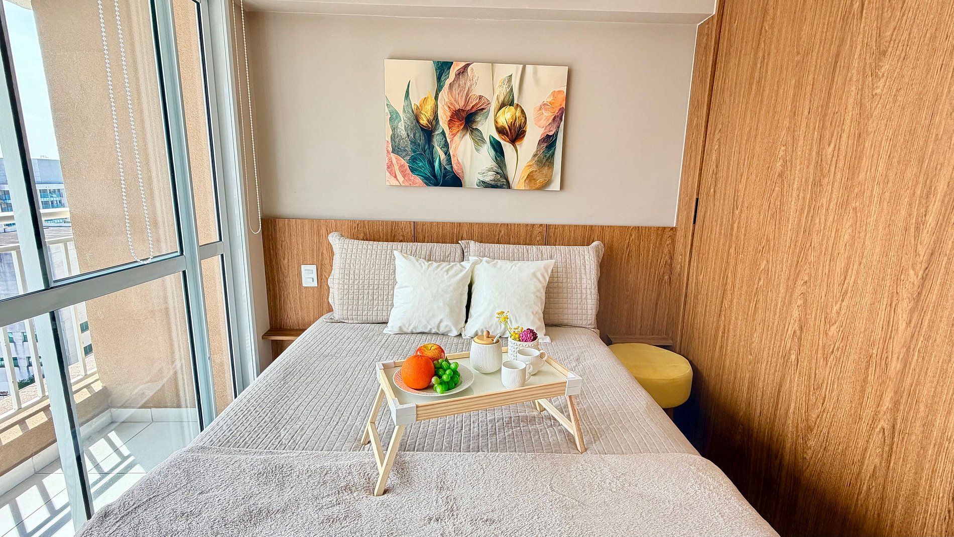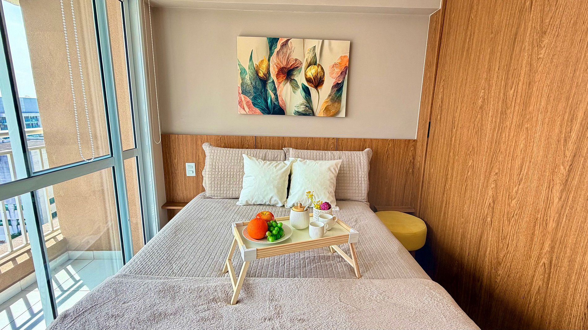 Um espaço com a decoração cheia de personalidade, ambientes integrados e equipamentos para acomodar com conforto até 2 pessoas, dispondo de uma cama de casal.