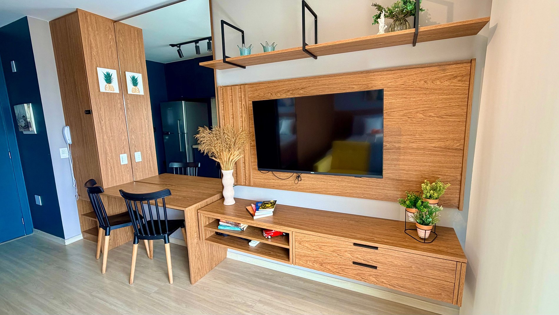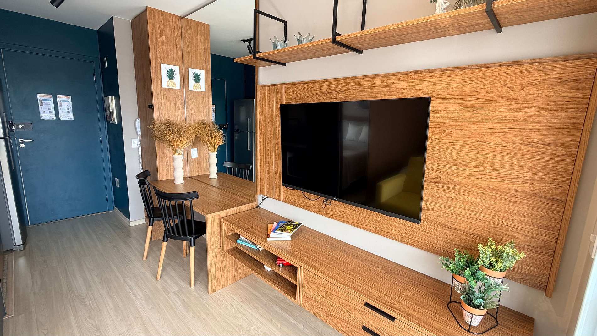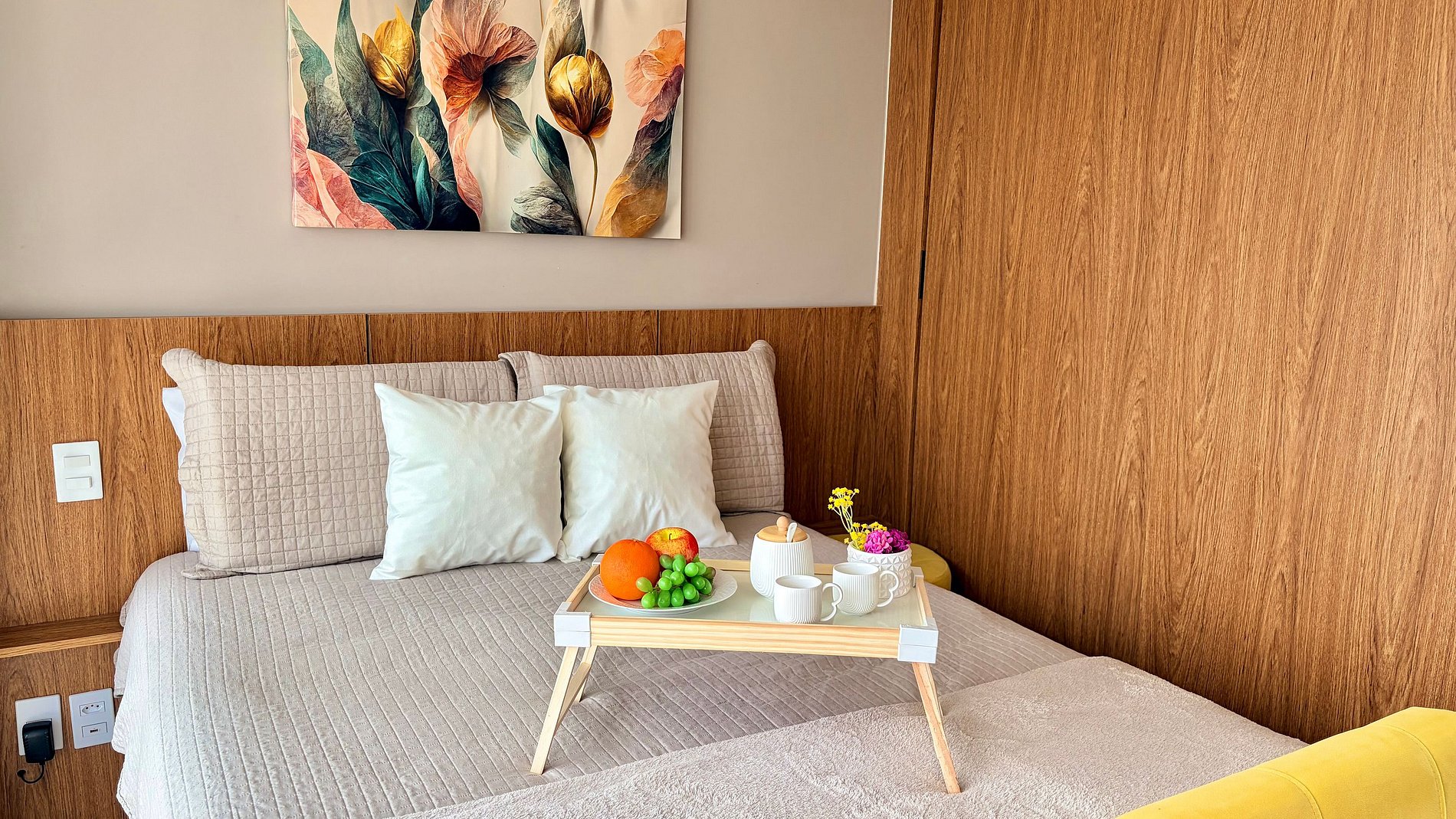 Um espaço com a decoração cheia de personalidade, ambientes integrados e equipamentos para acomodar com conforto até 2 pessoas, dispondo de uma cama de casal.